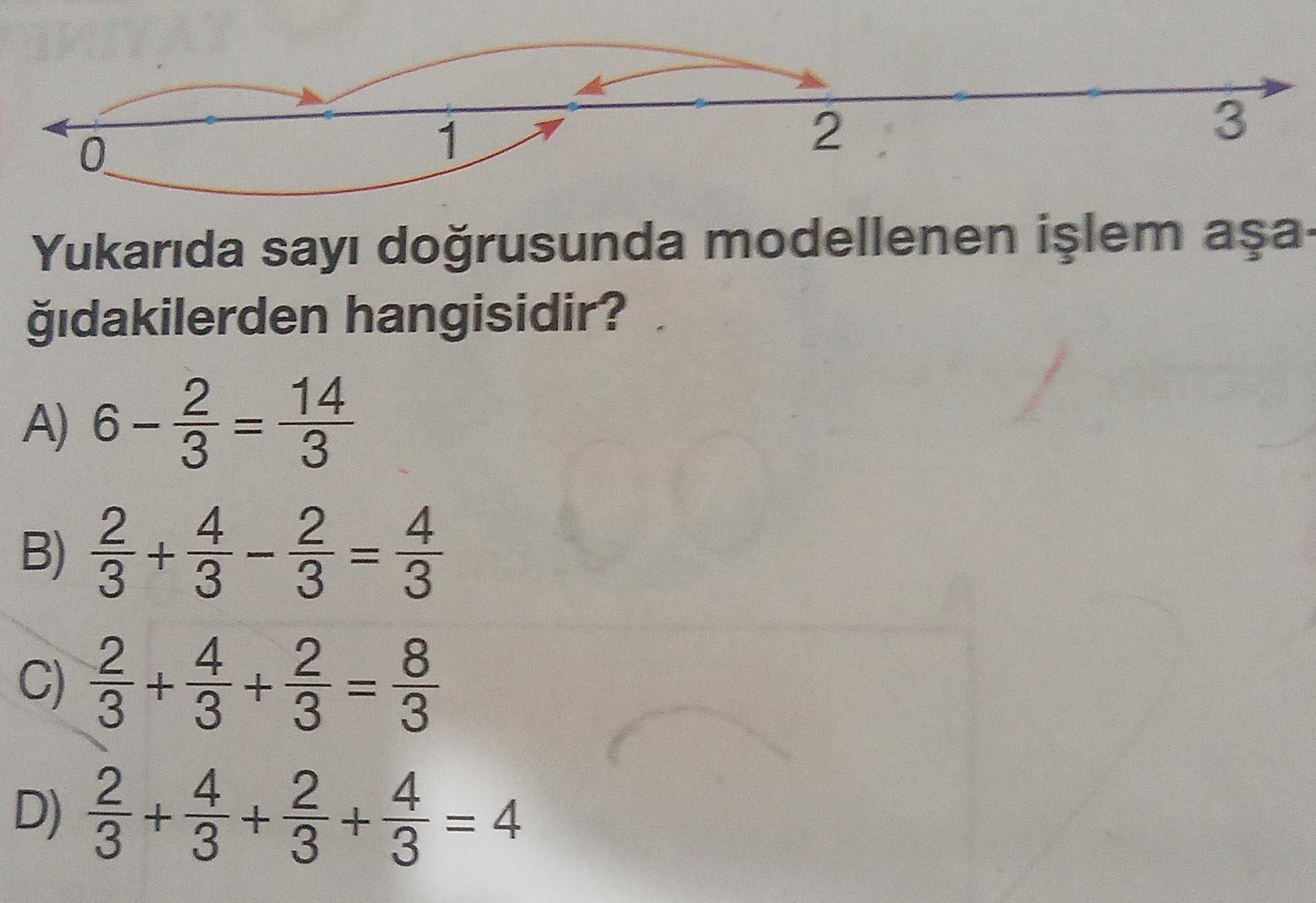 İki bölme ilerlemiş yani 2/3 dememiz gerekiyor (çünkü 3 bölme ilerleseydi 1 diyecektik ve 3/3 yazmış olmalıydık). Daha sonrasındaki ok 4 bölme ilerlemiş yani 4/3. Ve en sondaki ok ise geriye doğru 2 bölme gitmiş o zaman -2/3 demeliyiz. Bunun sonucunu hesaplarsak: 2/3 + 4/3 - 2/3 = 4/3.