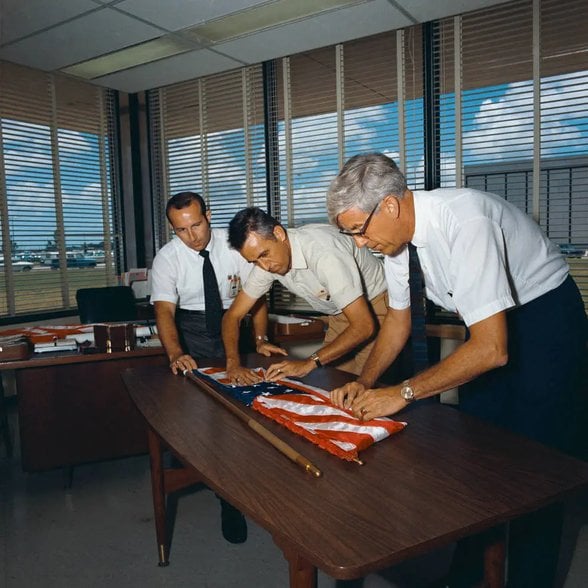 Yukarıdaki fotoğrafta mühendisler bayrağı araca yüklemek üzere son kez katlıyorlar.