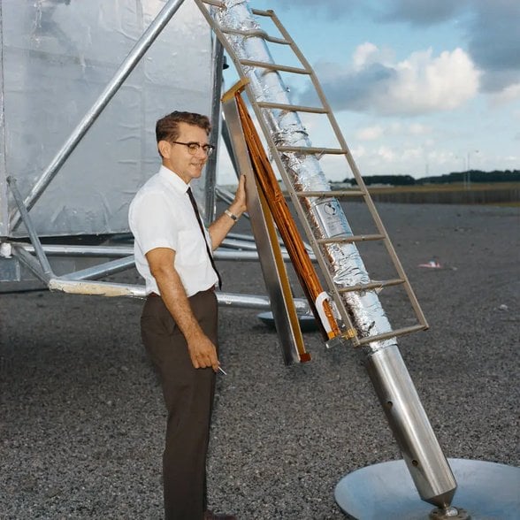Burada da LM Eagle'ın yeryüzünde kalan kopyasının iniş merdivenine bayrağın nasıl monte edileceği gösteriliyor. Fotoğraftaki kişi, mekanizmanın tasarımından sorumlu ekibin başındaki Şef Yardımcısı David L. McCraw. Yaptıkları şöyle anlatılıyor: