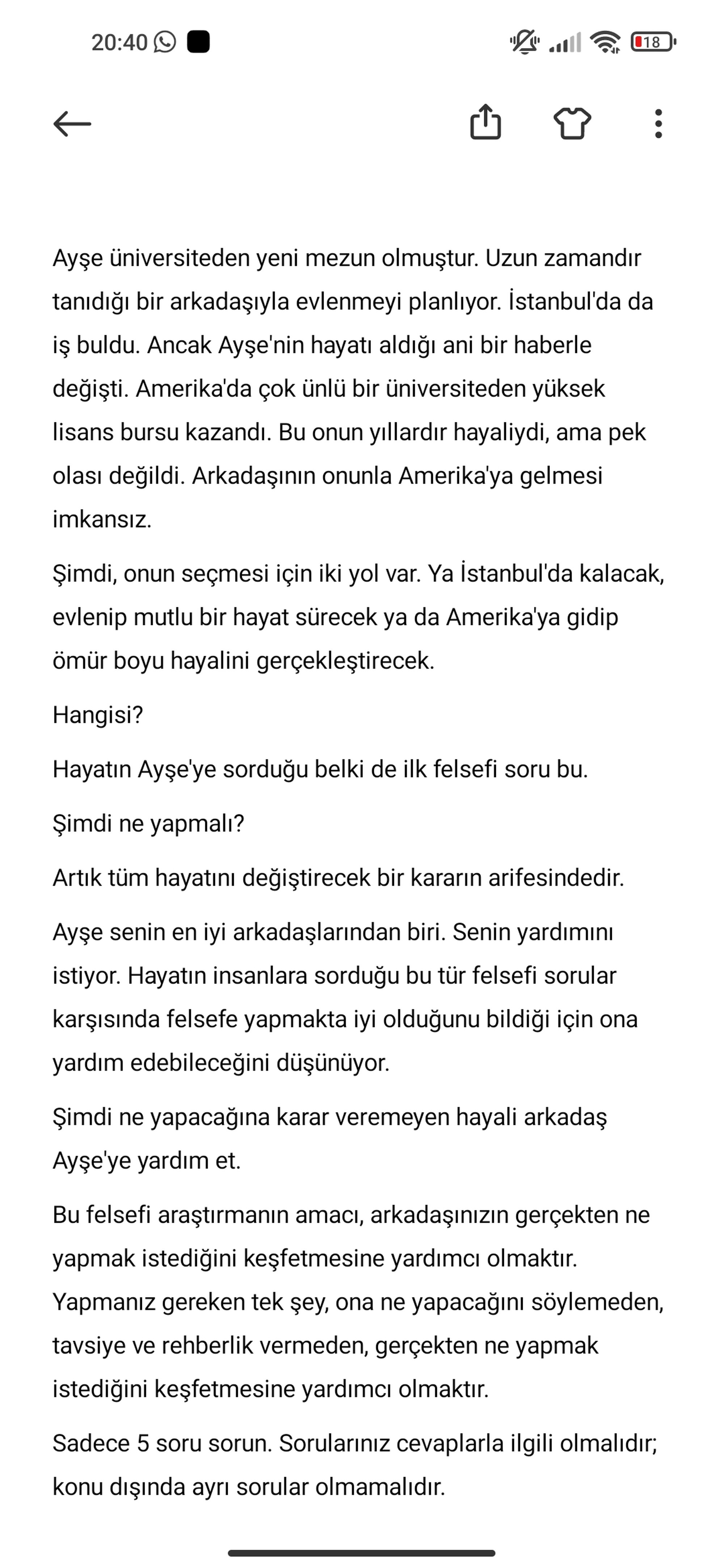 Sorular düşündürücü felsefik ve cevaplarla bağlı olmalıdır. Direkt cevabı olan sorular sorulmamalı. Ayşe'ye hazırladığımız soruları sorarak ne istediğine karar vermesi gerek.
