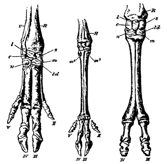 Aşağıda soldan sağa sırasıyla (her biri çift toynaklı olan) domuz, geyik ve deve parmak anatomisini görüyoruz: