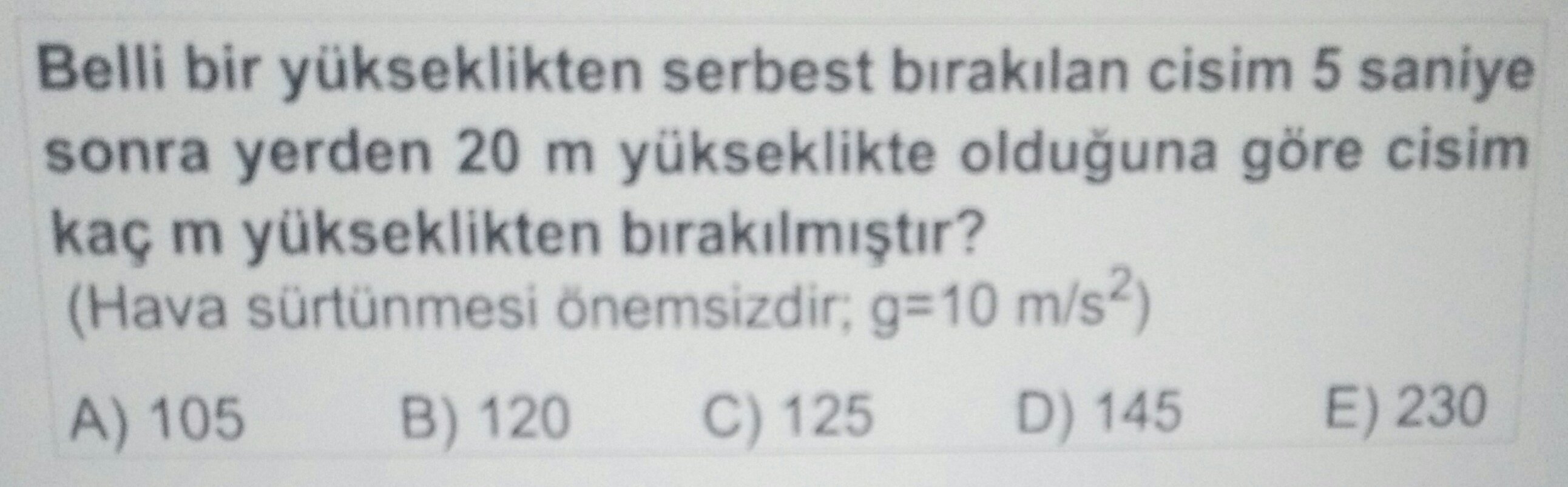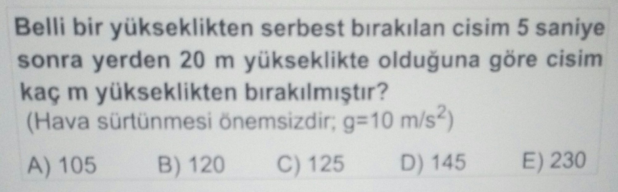 Belli bir yükseklikten serbest bırakılan cisim 5 saniye sonra yerden 20 m yükseklikte olduğuna göre cisim kaç m yükseklikten bırakılmıştır?