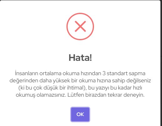 Ben hızlı okuma eğitimi aldım ve dakikada ortalama 600-900 kelimeyi anlayarak okuyabiliyorum. Böyle hızlı okuduğum için sistem beni okumuş olarak saymıyor. Ne yapmalıyım? Bu sorunu düzeltebilir misiniz?