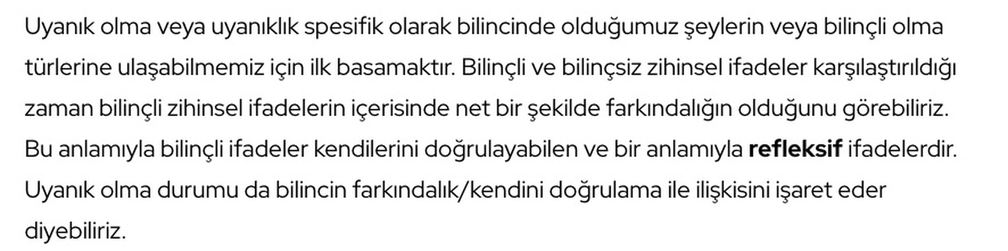 Sanıyorum yazıda kendini doğrulama halinin de bir nevi doğrulama halinin kendisi bakımından refleks gibi olduğu ifade edilmiş. Yani burada kolumuzu kaldırmak istediğimizde kolumuzu kaldırırken motor duyular vs sinirlerde belki bir ansiklopediye sığabilecek kadar sinirsel hücresel faaliyet tamamen bilinçdışı bir şekilde olur biter. Biz sadece kolumuzu kaldırmayı isteriz gerisi bilinçdışı olarak gerçekleşir. Bu açıdan biz sadece dileriz ve isteriz gerisi kontrolümuz ve bilincimiz dışındadır. Bu nedenle doğrulama açısından da aynı şey söz konusu deniyor olabilir. Biz bilinçle doğrulamayı yaparken beynimiz bunun sinirsel mekanizmasında tıpkı kolumuzun kalkmasındaki gibi gerisini otomatik halleder. Veya ikinci ve yukardaki açıklamalarla bağlantılı bir anlam olarak da farkındalık halinin bilinçli düşünce halinde[otomatik olarak gerçekleştiği veya ortaya çıktığı da ifade edilmek istenmiş olabilir.