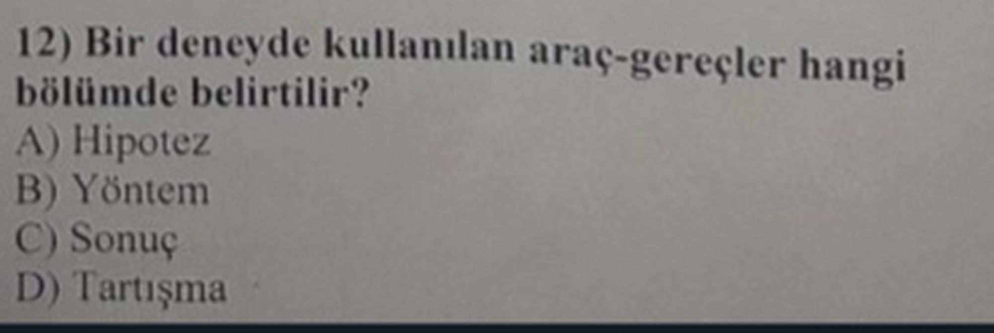 Yanıt B. Bilimsel makalelerde yayımlanan deneylerde/araştırmalarda kullanılan araç-gereçler, yol-yöntemler; genelde "yöntem" ya da "gereç ve yöntem" gibi alt başlıklarda verilir.[1] Aşağıda bir örnek bıraktım.