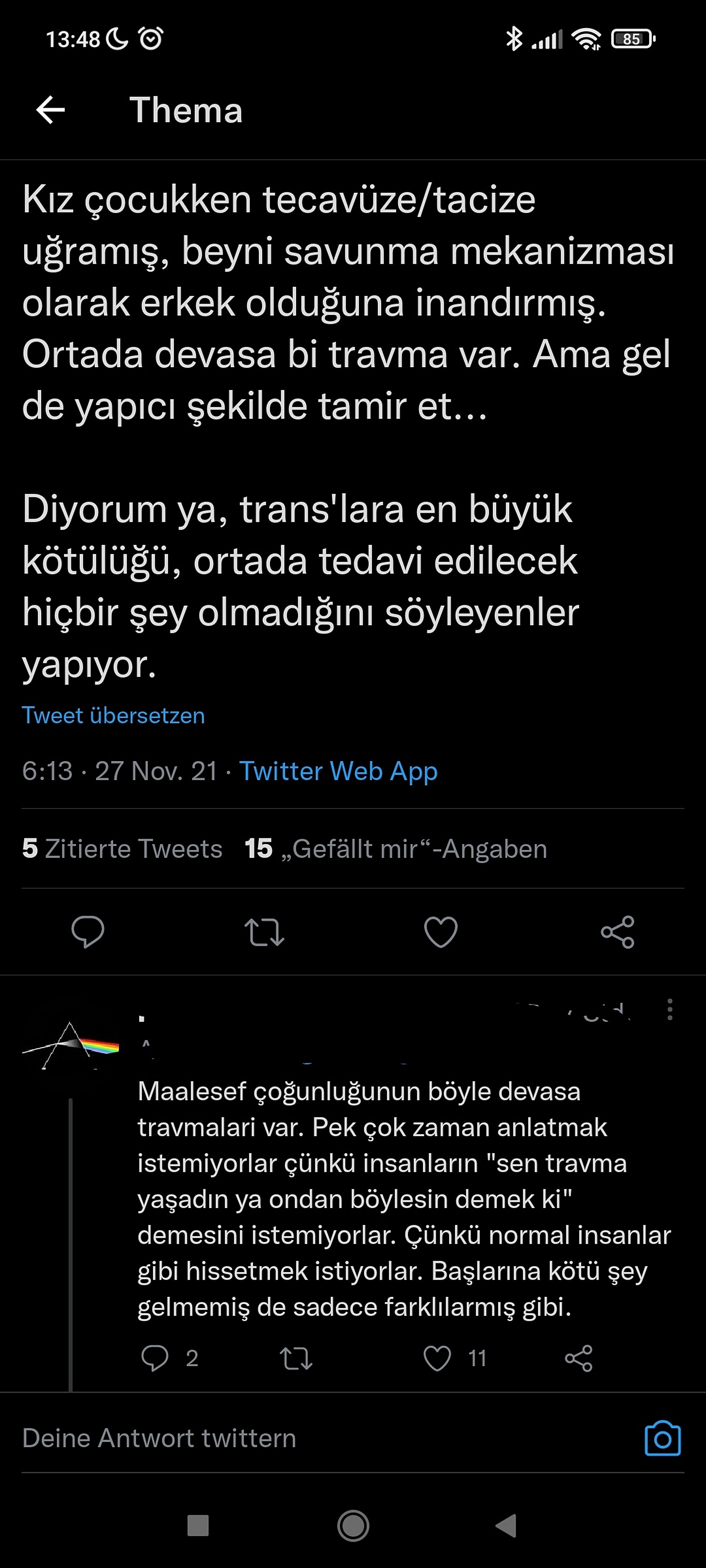 Tweetteki gibi spesifik nedenlerle olmasa da dış etkenlerden kaynaklanamayacağını nerden biliyoruz? Daha birisinin neden trans olduğunun açıklamasını bile tam olarak yapamıyorken hem de. Burda okuduğum makalelerde de sadece "öyle" olduğu söyleniyor ama "neden" ve "nasıl" yok.