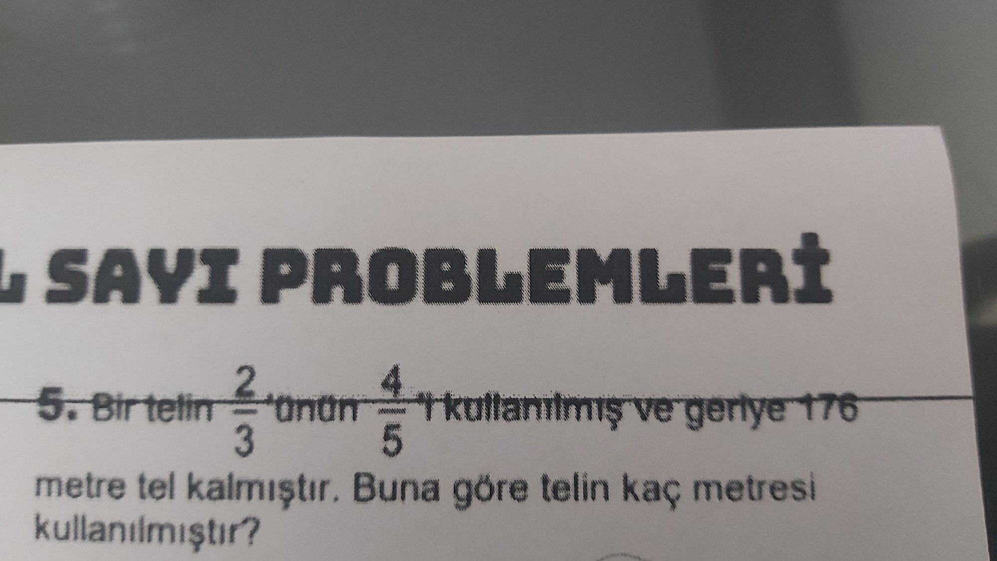 Kesirdeki sayılara tam bölünebilmesi adına telimin uzunluğu 15x olsun. 15x telimin 2/3'ü 10x tele eşittir (15x.2/3). 10x telin 4/5'i kullanılmış bu da 8x'e eşittir (10x.4/5=8). 176 metre tel kaldığı söyleniyor, toplam tel uzunluğumdan kullandığım tel uzunluğunu çıkarırsam 7x kalır (15x-8x=7x). 7x=176 metre ise kullandığım tel yani 8x = ?. Bu denklemi çözmemiz lazım. (176/7)*8'den cevabı 1408/7 metre buldum.