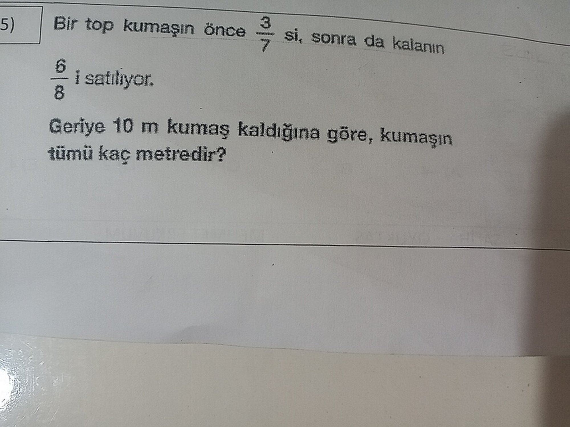 Bir top kumaşın 3/7 si sonra da kalanının 6/8 i satılıyor. Geriye 10 m kumaş kaldığına göre kumaşın tümü kaç metredir?