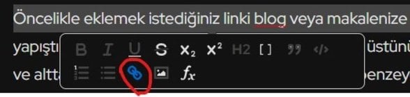 Öncelikle eklemek istediğiniz linki blog veya makalenize yapıştırıyorsunuz ardından imlecinizle bütün linkin üstünü seçiyorsunuz ve altta seçenekler çıkıyor. Oradan zincir şekline benzeyen sembole tıkladığınız zaman hyperlink olarak linkinizi eklemiş oluyorsunuz. Ya da yeni bir satıra başladığınızda sol tarafta çıkan + işaretine tıkladığınızda da zincir şeklindeki hyperlink işaretini görebilirsiniz.