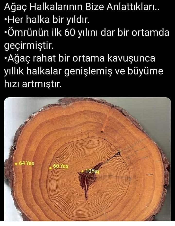Evet doğru. Canlı ve sulak mevsim olan ilkbaharda köklerden yapraklara taşınan su, yapraklardan toplanan güneş ışığı ve dolayısıyla üretilen besin daha fazla olduğu için, gelişim daha hızlı ve gövdedeki halkalar daha geniş; buna karşın gelişimin zayıf olduğu diğer dönemlerde halkalar daha dar olur. İlkbahar odunu (açık renkte ve geniş) ve yaz odunu (dar, yoğun ve koyu renkte) olarak adlandırılan bu tabakalar birlikte bir yıllık halkayı oluştururlar. Yıl halkalarının her birinin bir diğerinden daha geniş veya daha dar, daha açık veya daha koyu renkte olması, o yıl ağacın bulunduğu gelişim evresi ve çevresel koşullarla şekillenmektedir. İşte tam bu noktada, büyüme halkalarının ardı ardına dizilerek oluşturduğu barkod benzeri açıklı koyulu renk diziliş modeli dendrokronoloji biliminin temel girdisini oluşturmaktadır.