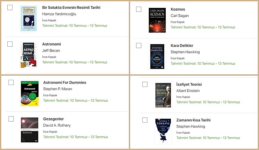 Merhabalar son günlerde astronomiye olan ilgim giderek artıyor. Bende bu ilgiyi doyurabilmek için kitaplara başvurmak istedim. Şöyle bir kitap listesi yaptım. Bu kitaplar arasından "bu iki kitap benzer konuları işliyor, ikisini de okumana lüzum yok" dediğiniz kitaplar var mı? İkinci olarakta sizce kitaplar hangi sıra ile okunmalılar.