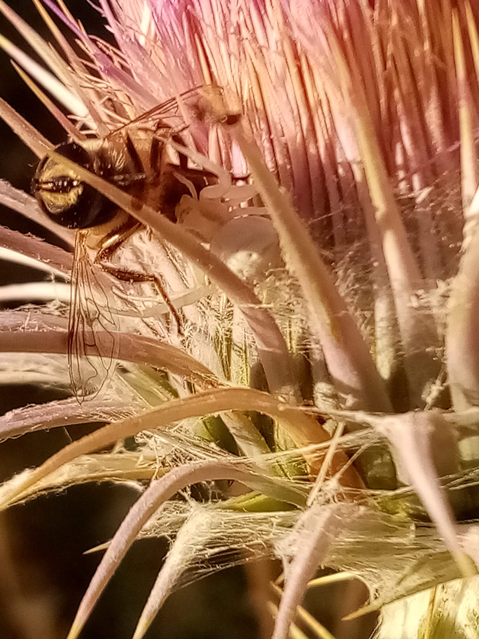 Fotoğrafı nerede çektiğinizi bilebilsem daha isabetli olabilirdi ancak görünüşüne göre beyaz yengeç örümceği (white crab spider/thomisus spectabilis/australian crab spider) diye tahmin ediyorum. Diğer ihtimal ise çiçek örümceği (goldenroad crab spider/misumena vatia)[1]
