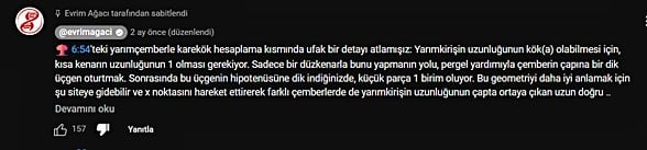 Burdan da uzunluğu 'nin karekökü olur. Bu teoremin ispatı için öklid ve Çapı Gören Çevre Açı kullanabilirsiniz.