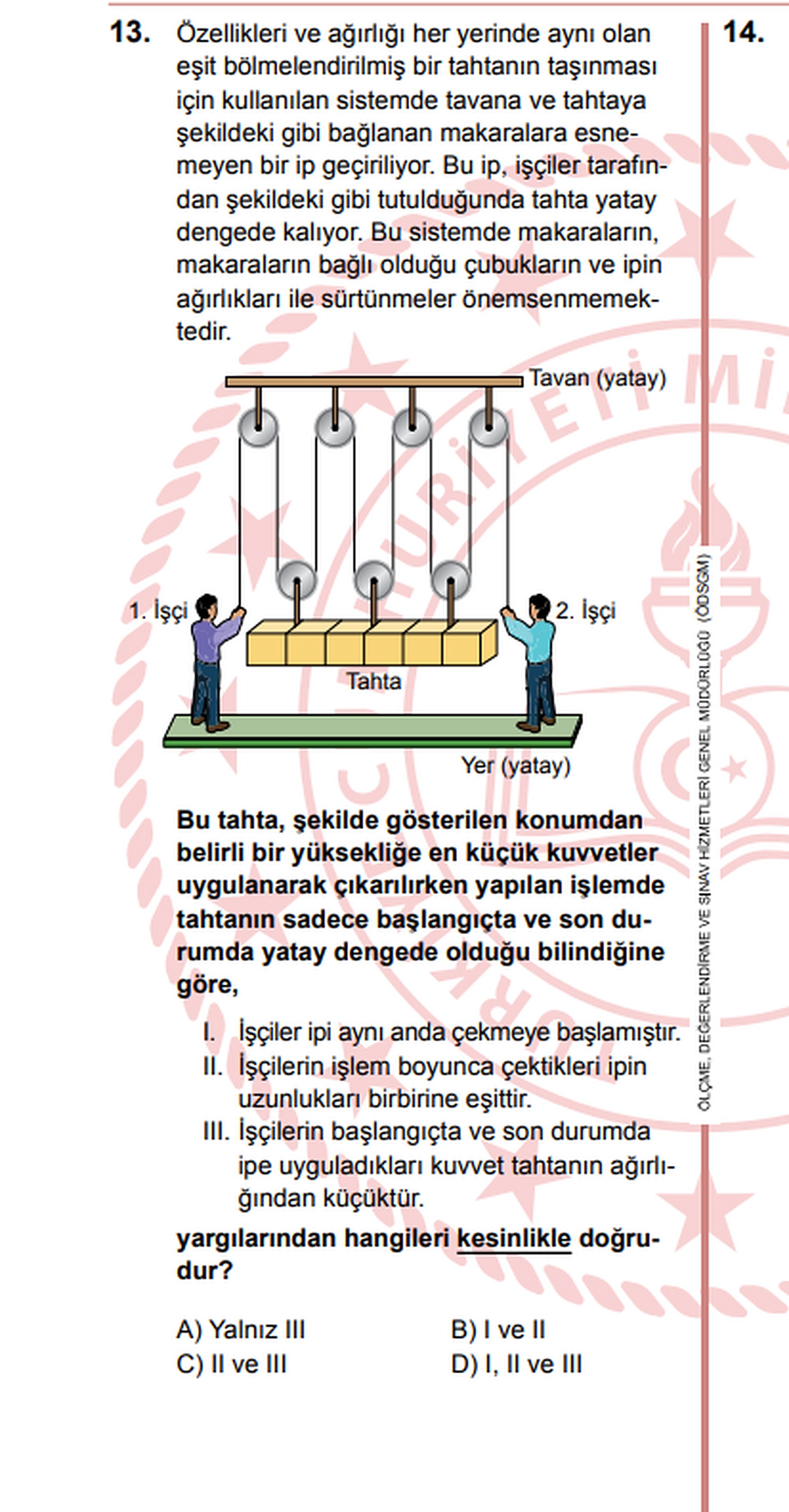 LGS'deki toplam 3 yanlışımdan biri bu ve hala da A seçeneği olduğunu düşünüyorum. Cevabı C olarak gösteriyorlar fakat sürtünmeler iptal edilmiş ve ip herhangi bir yere bağlı değil yani 2 işçi aynı ipi kullanmış. Bu durumda sona kadar çekildiğinde bir işçi hiç çekmemiş olsa bile yatay denge durumuna gelmiş olmalıydı. Cevap Yalnız III. ve sorunun cevabı yanlış açılmıştır. Üzerine tartışılacak bir konu değildir.[1][1]
