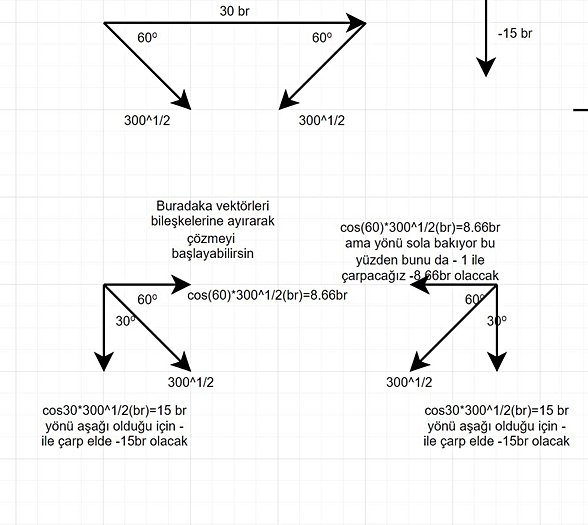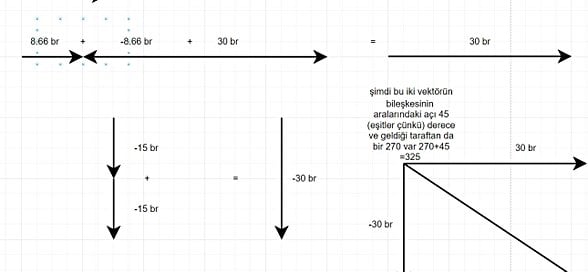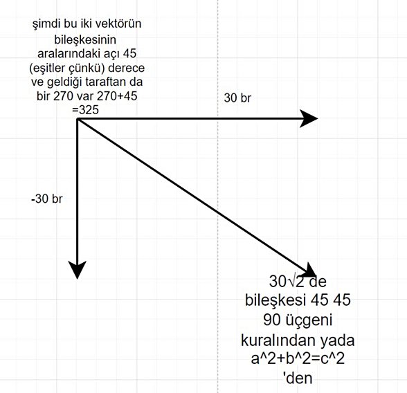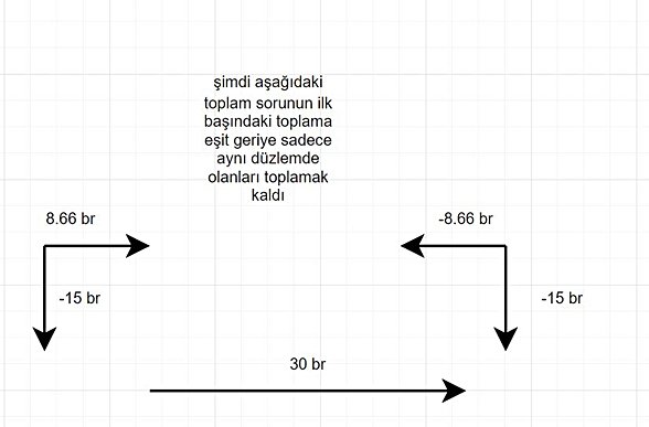 10√3.√3=30birim buluruz ve yönü aşağı olacak şekilde çıkar. bir tane de sağa doğru 30birimlik vektörümüz vardı. Bu ikisini de uç uca eklersek, aralarındaki açı 90° olur.