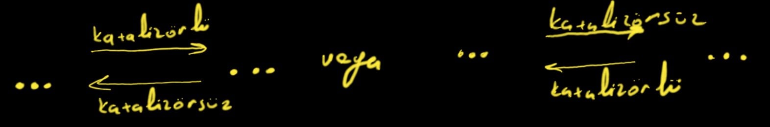 Hidrojen ve azotu amonyağa çevirirken demir katalizör olarak kullanılıyor ancak amonyağı hidrojen ve azota çevirirken kullanılmasına gerek yok. Tepkimenin ne yöne gideceğini belirleyen şey çevre koşulları amonyak üretmek için gereken çevre koşulları demirin katalizörlüğünde 400-450 C derece ve 200 ATM. Eğer basınç azaltılıp sıcaklık arttırılırsa tepkime tersine dönmeye başlıyor. Ama eğer sıcaklık 450 celcius derecenin üzerine çıkartılıp basınç düşürülürse tepkime sola kayıyor amonyak bu durumda azot ve hidrojene dönüşmeye başlıyor.