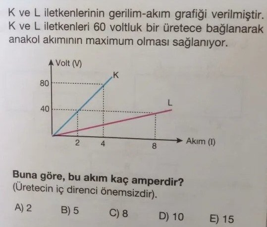 Anakol akımı parelel bağlı devrelerde ayrı kollar üzerinden geçen akımların toplamıdır. Soruda K ve L iletkenlerinin gerilim-akım grafiği bize bu iletkenlerin dirençlerini de verir ( V=İR) bu değer K için 20 (40=2R) ,L için ise 5 (40=8R)’dir . 60voltluk bir üreteç paralel bağlı kollardan eşit gerilim geçirir(V) . Kollardaki akımları V=IR eşitliğiyle herbir kol için hesaplarsak:
