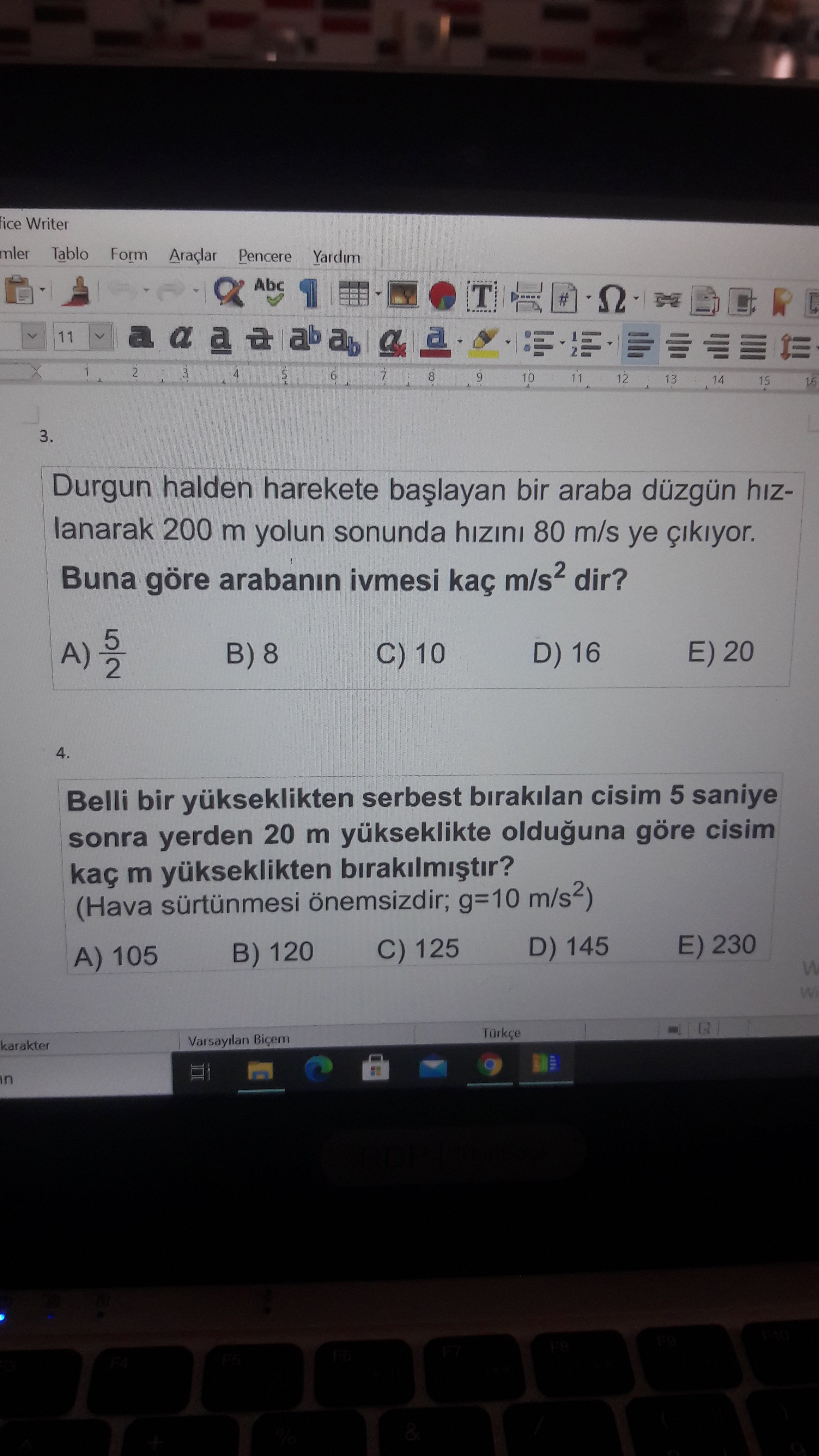 Bu förmüle göre soruda verilenleri yerine yazalım; V = 80 m/s, V0= 0 m/s, x=200m