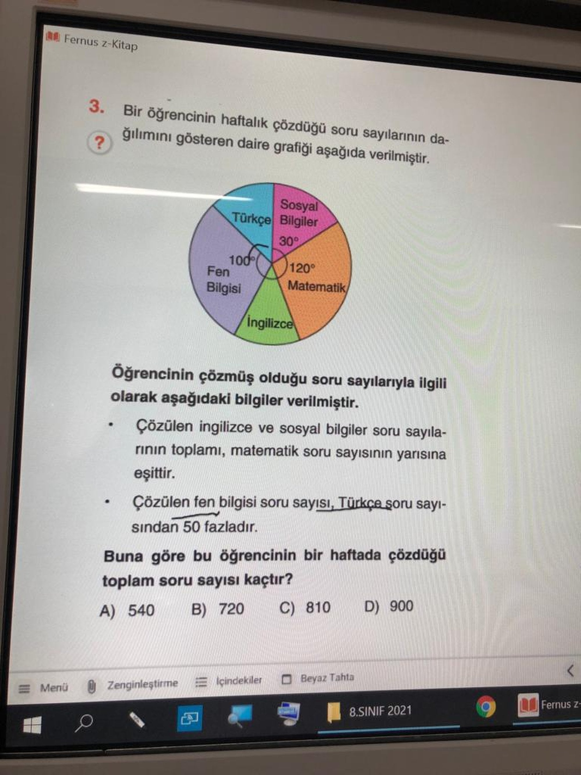 Toplam açı 360 (360k) olacağından Türkçe dersi için çözdüğü soru sayısı 80k olur (yani 80° olur).