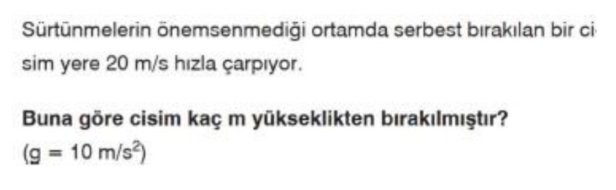 Sürtünmelerin önemsenmediği ortamda serbest bırakılan bir cisim yere 20 m/s hızla çarpıyor. Buna göre cisim kaç m yükseklikten bırakılmıştır? (g = 10 m/s)