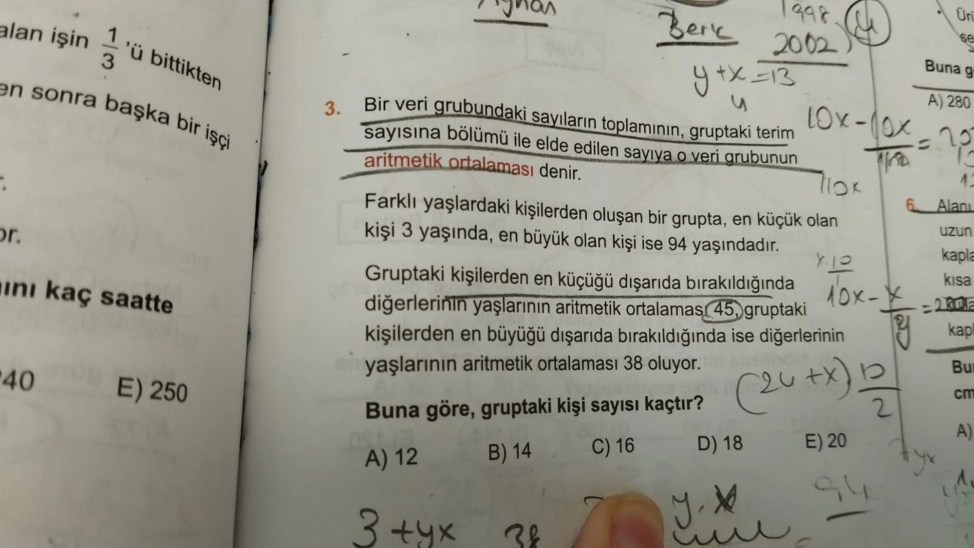 Şimdi ilk başta 3 ü saymadan ortalama 45 ise ve sonra sadece 94 ü saymadan ortalama 38 ise demekki bu guruptaki insan sayısının bir eksiğinin toplam yaşından 91 çıkınca ortalama 7 azalıyormuş bu da demek oluyor ki bu bir kişiyi çıkartmış olduğumuz gurupta 91/7 den 13 kişi var diğer çıkardığımız kişiyi eklersek eğer 14 kişi yapar cevap 14 dür
