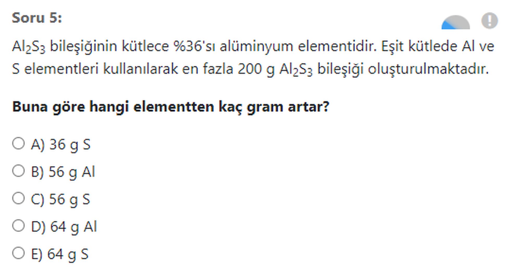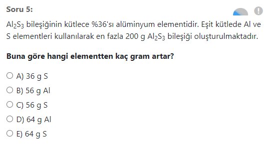 100 gramın 36'sı Al'ye aitmiş. Bize sorunun son cümlesinde 200 gramlık bir bileşiğin oluştuğunu söylüyor. Aynı şekilde bu bileşik oluşmuşsa bu oranı sağlamalı. Yani 200 gramın %36 sı olan 72 sayısı Al elementinin kütlesidir. 200-72'den 128 gram da S elementine ait olmuş olur. Başlangıçta bu elementlerden eşit kütleli aldıklarına göre: Al ve S elementlerinden 128'er gram almışlar. (Neden 128'er gram? Çünkü en fazla kullanılana göre eşit kütlede alırsın.) ve bunun sonucunda oran nedeniyle S'nin hepsini kullanmışlar ama Al elementinden (oran nedeniyle) 72 kullanmışlar. Görüldüğü üzere Al elementi fazla kalmış.