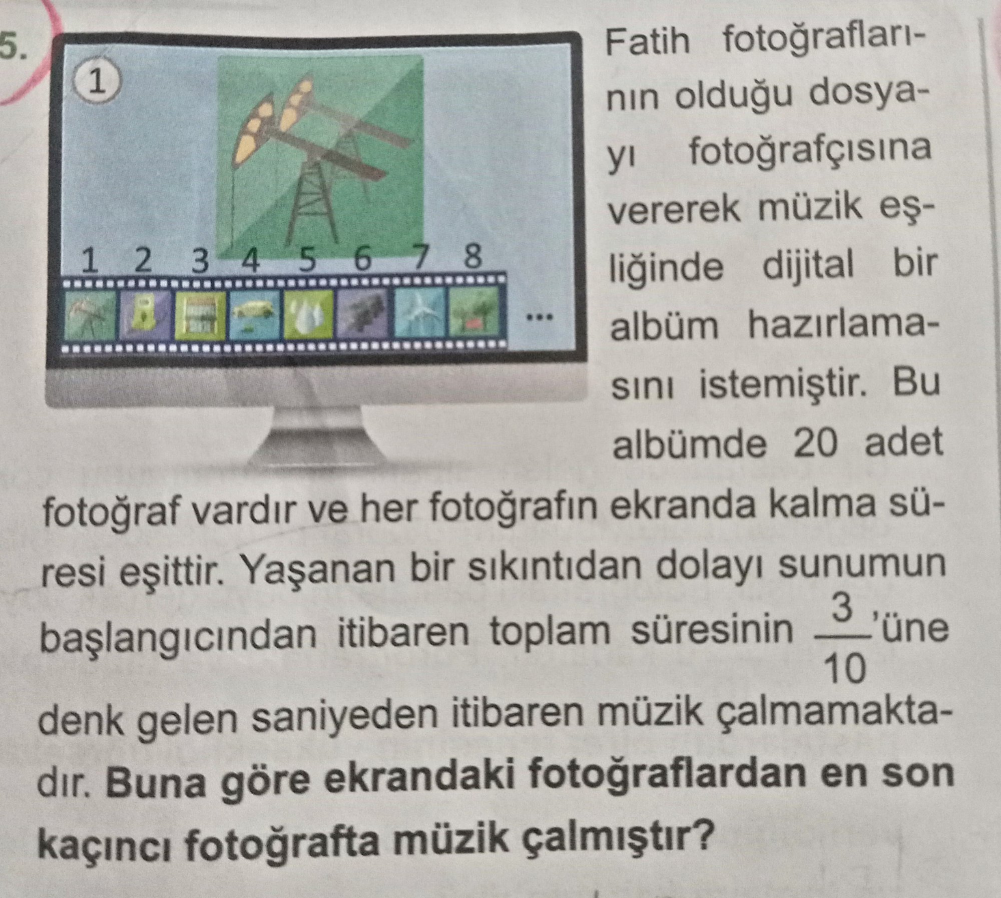 Fatih fotoğrafları nin olduğu dosyayı fotoğrafçısına vererek müzik eşliğinde dijital bir albüm hazırlama- sini istemiştir. Bu albümde 20 adet fotoğraf vardır ve her fotoğrafın ekranda kalma sü- resi eşittir. Yaşanan bir sıkıntıdan dolayı sunumun 3 başlangıcından itibaren toplam süresinin 'üne 10 denk gelen saniyeden itibaren müzik çalmamakta- dır. Buna göre ekrandaki fotoğraflardan en son kaçıncı fotoğrafta müzik çalmıştır?​