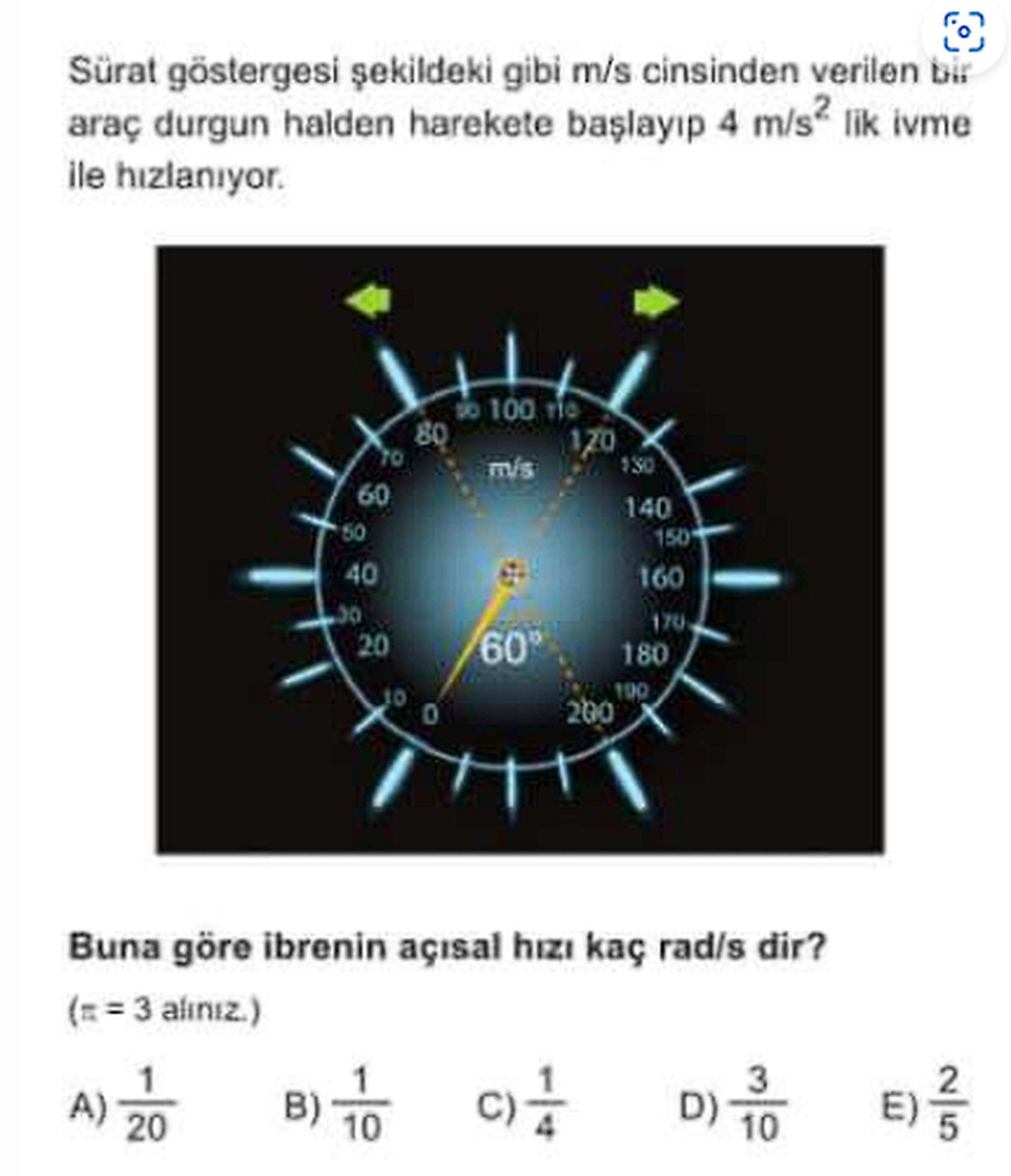 Buna göre ibrenin açısal hızı kaç rad/s'dir?