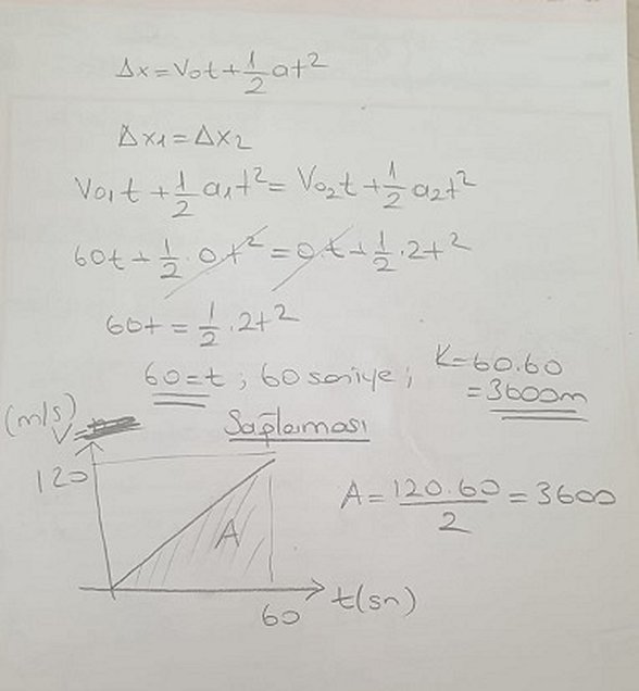 Kinematik denklemlerinden olan x1-x2= V0t + 1/2 at2 formülünü kullandık. Bu formül bize yanyana gelmeleri için geçen zamanı verdi. Ardından zamanı herhangi bir araçta (Ben K'yi seçtim) X=Vt' den aldığı yolu hesapladık.
