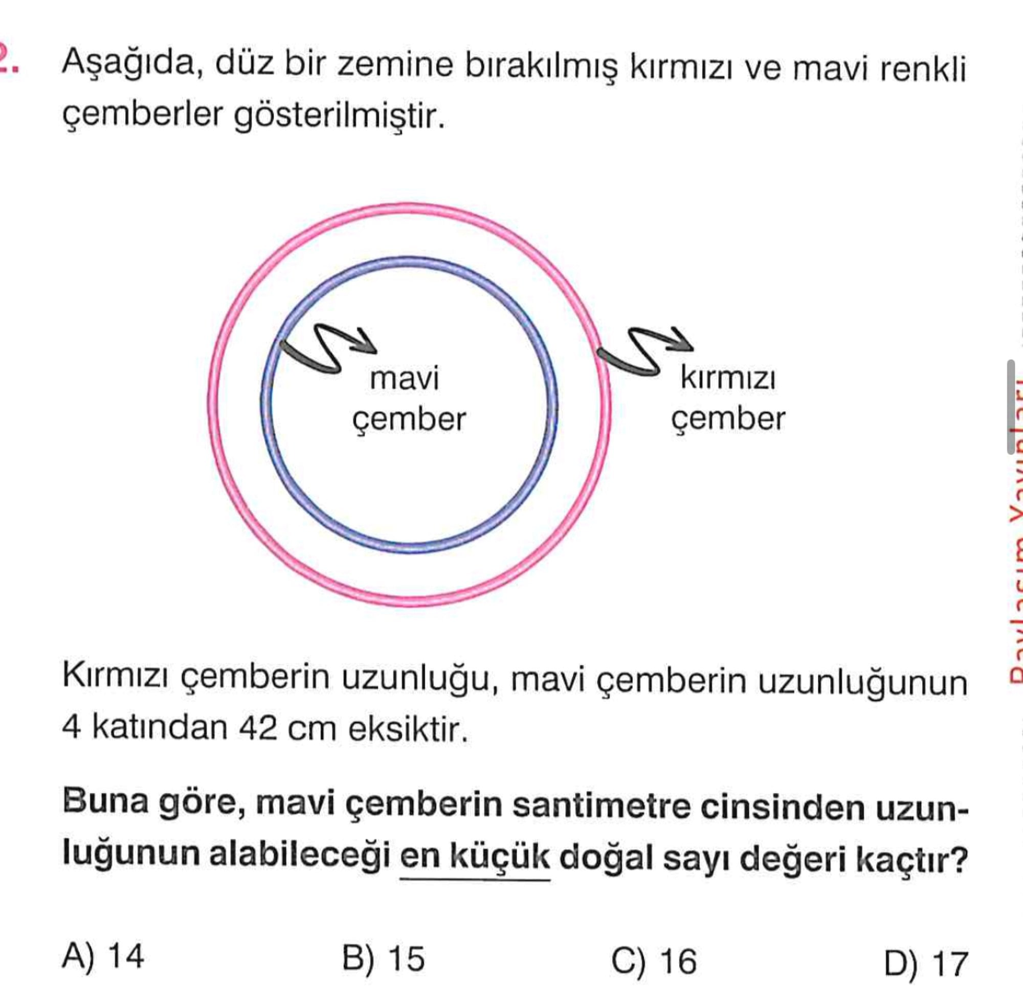 Buna göre, mavi çemberin santimetre cinsinden uzunluğunun alabileceği en küçük doğal sayı değeri kaçtır?