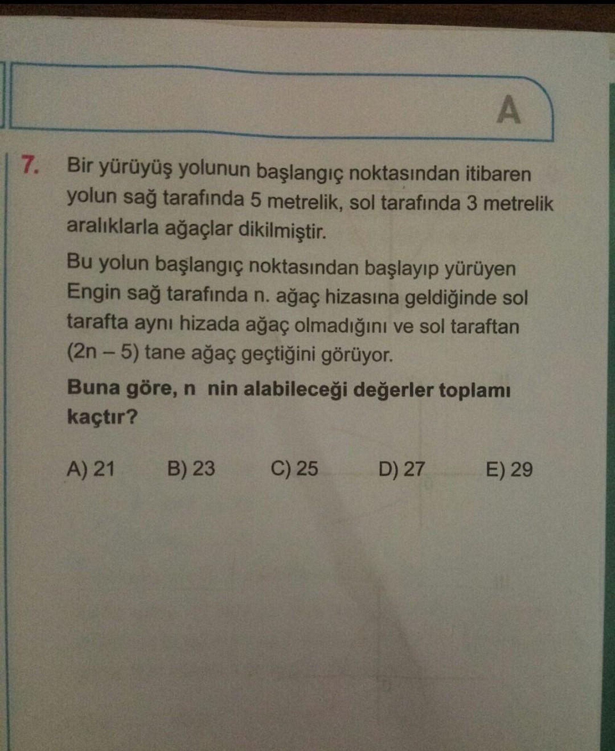 Yolun sağ tarafında "n" tane ağaç geçmiş ve geçtiği her ağaç 5 metre sayılacağı için toplam "5n" metre yol gitmiş. Aynı yolu yürüdüğü için sol taraftaki değer ile eşit olacak. Peki sol tarafta ne kadar gitmiş? 2n-5 ağaç geçmiş fakat bunların arasında 3'er metre varmış. Ve bununla birlikte en son geldiği konumda sol tarafında ağaç yokmuş. (yani yolun sol tarafından bakarsak 2n-5 tane ağacı geçip az bir miktarda ilerlemiş oluyor. Neden az bir miktar dedim? Çünkü bu miktar 3 metreden az olmalı yoksa sol taraftan bakarsak ağaç hizasına gelir. Ama soruda gelmediğini söylemiş, dolayısıyla burası önemli.) Bu az bir miktar ilerlemeyi şöyle tanımlayabiliriz 3>x>0.