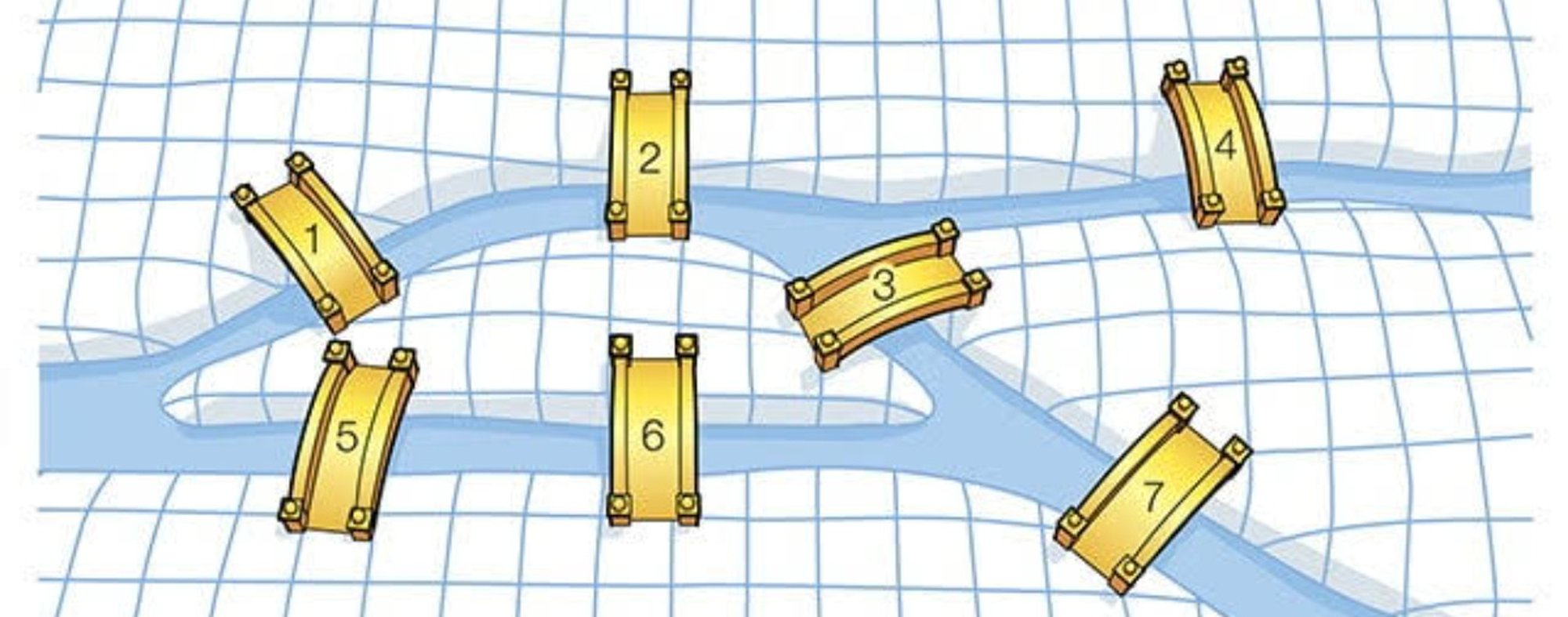 Bu problem Königsberg'in Yedi Köprüsü olarak bilinir ve her köprüyü bir kez kullanarak gezmek imkansızdır.
