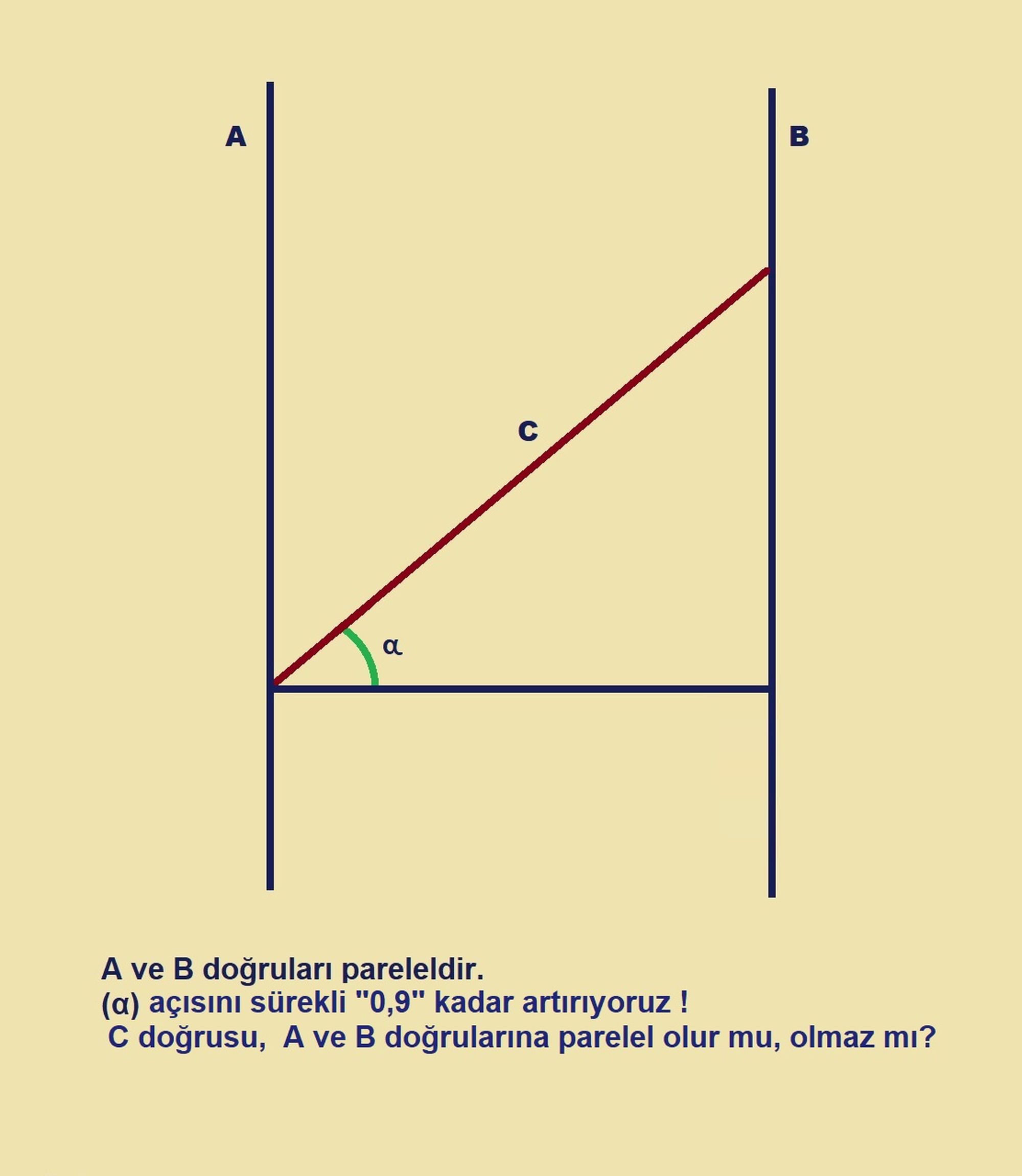 A ve B doğruları birbirine paraleldir. α açısını sürekli 0,9 kadar artırıyoruz.