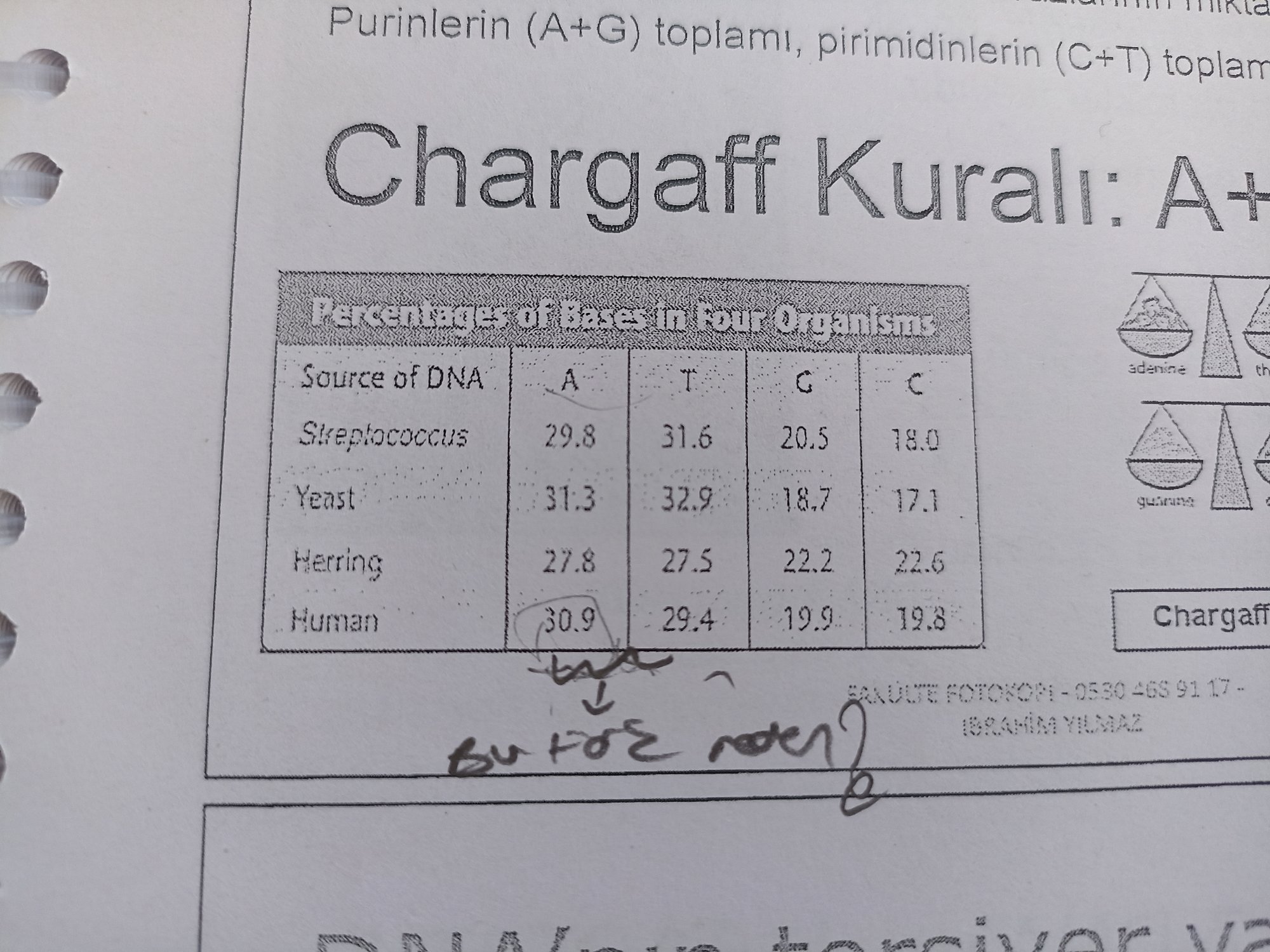 Chargaff kuralına göre herhangi bir türde DNAdaki adenin= timin, g=c  fakat insan organizasyonda yuzdelikleri eşit değil bu fark neden kaynaklanıyor?