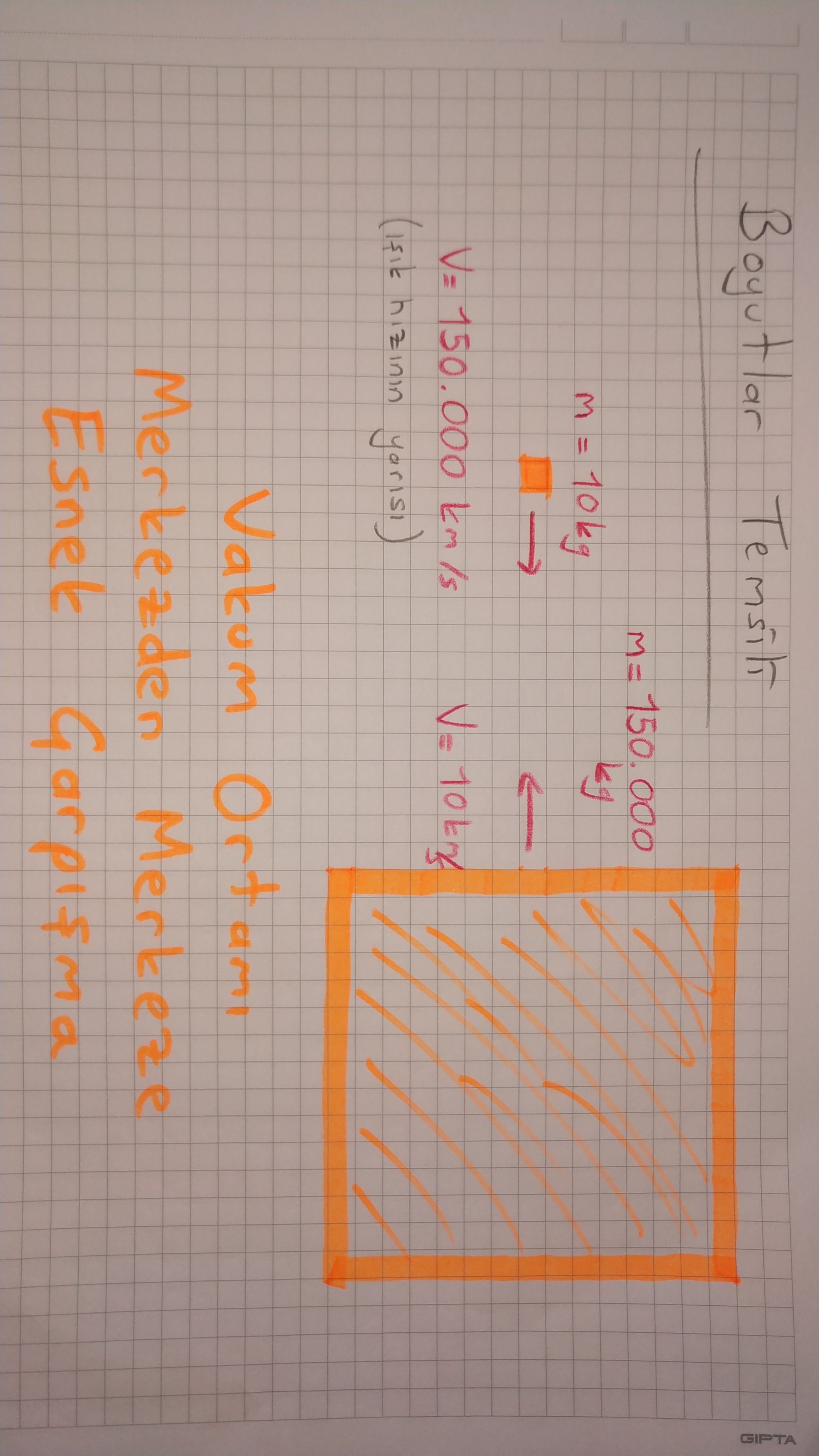 Vakum ortamı, ve küçük olan cismin diğerini delip geçmediğini varsayarsak yani basınç ve cisim sağlamlığını göz ardı edersek, yok diyelim ayrıca kütle çekimi, elektromanyetik kuvvetleri de hiçe sayalım, lütfen soruyu anlamak için görsele bakınız.Bu hız ve kütleler ile durum ne olurdu ?