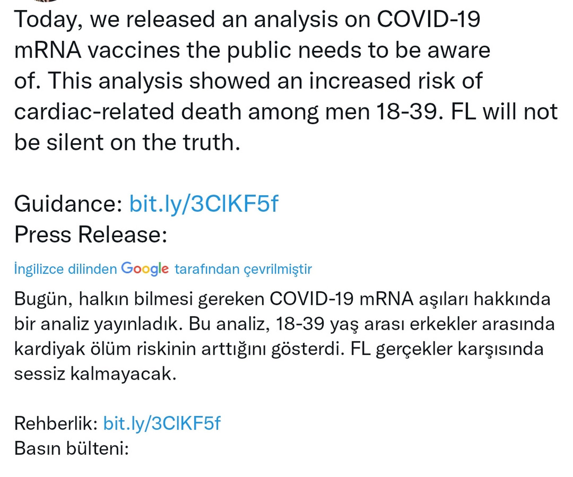 Merhaba bugün Twitter'da bir haber okudum Amerika'nın Florida eyaletinden bir araştırma yayınlanmış mRNA aşılarının 18-39 yaş arası kalp krizlerine neden olduğuna dair bir makale yayınladı. İçerik İngilizce olduğu için detayını öğrenemedim. Konu ile ilgili bilgisi olan yazabilir mi?