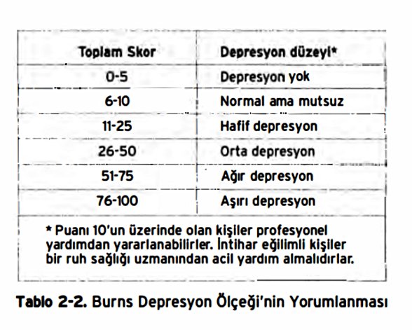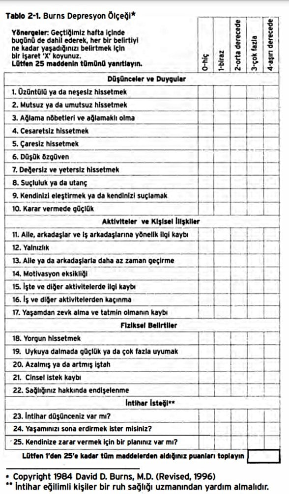 BDÖ'de skorunuzu hesaplamanın yanında, 23, 24 ve 25'inci maddelere özellikle dikkat etmeniz gerekmektedir. Bunlar intihar eğilimlerinizi, isteğinizi, planlarınızı sorgular. Herhangi birinde puanınız yüksekse hemen profesyonel yardım alınanızı tavsiye ediyorum.