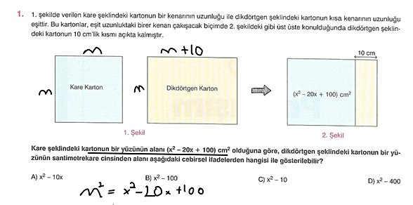 Karenin bir kenarına m diyelim. Karenin alanı ile yani ile bulunur. O halde olur. Şimdi ise çarpanlara ayırma bilgimizi kullanmamız gerekiyor. Eşitliği ikinci tarafını çarpanlara ayırırsak; yani buluruz yani buda bize karenin bir kenarını ve dikdörtgenin kısa kenar uzunluğunu verir. Şimdi kısa kenar çarpı uzun kenar işlemini yaparak dikdörtgenin alanını bulalım. Kısa kenarı bulmuştuk uzun kenar ise şekilden anlaşılacağı gibi kısa kenardan 10 cm daha uzun yani uzun kenar=x olacak. Şimdi çarpmayı yapalım sonucu bulunur. Yani cevap A şıkkı.