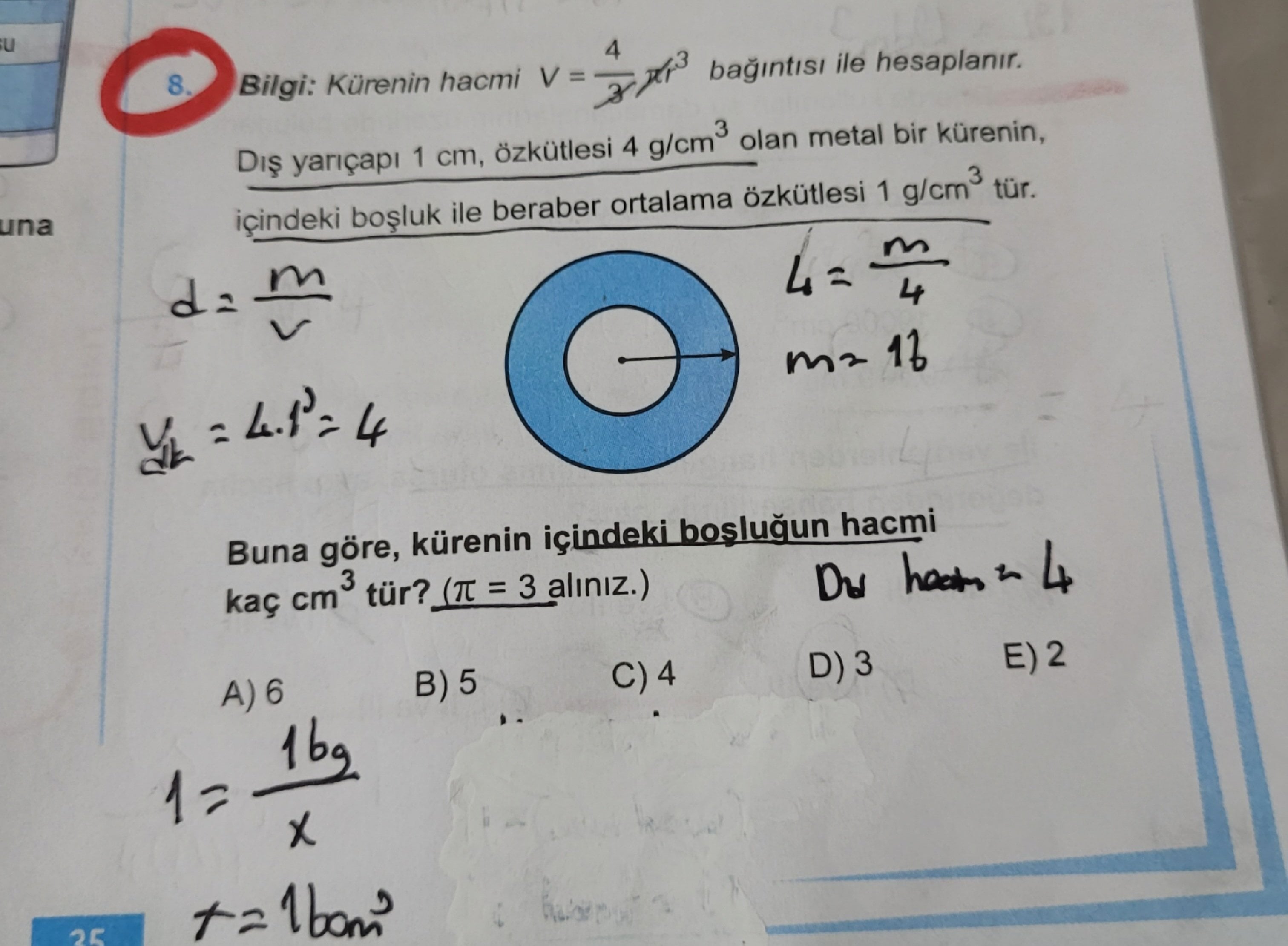 Dış yarıçapı 1 cm, özkütlesi 4g/cm³ olan kürenin içindeki boşluk ile beraber özkütlesi 1g/cm³'tür. Kürenin boşluğunun hacmi kaç cm³'tür?
