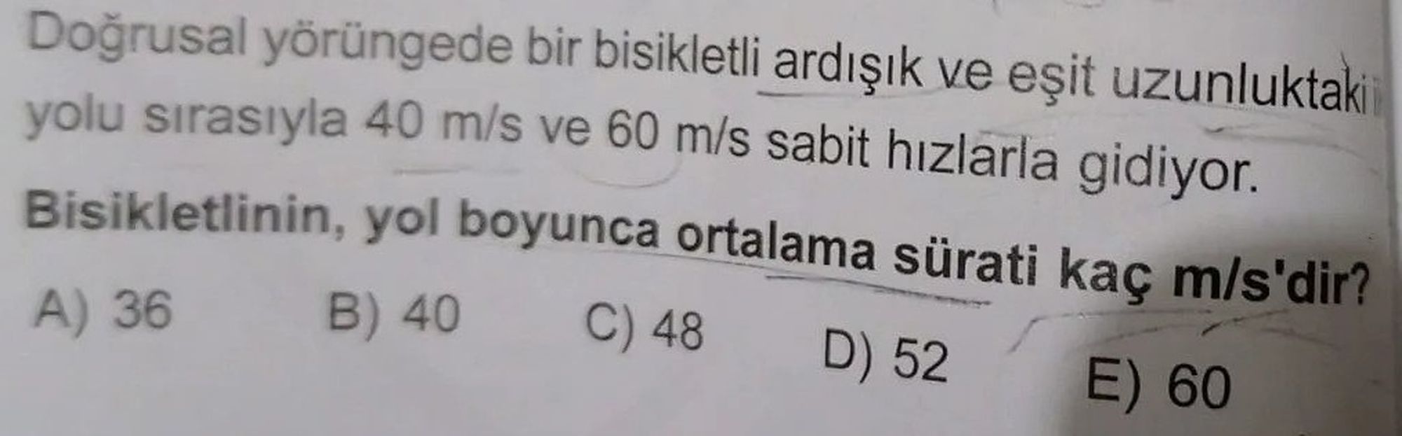 Bu formüle bilgileri koyarsak : 480k ÷ 10k dan ortalama sürat 48 m/s bulunur.