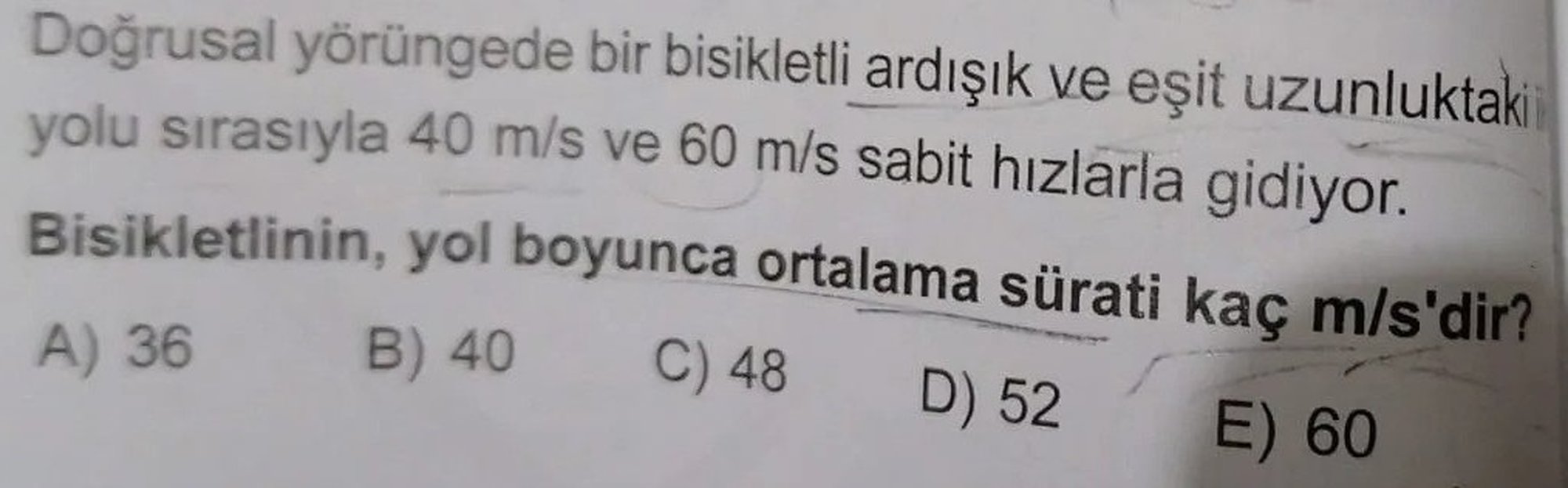 Doğrusal yörüngede bir bisikletli ardışık ve eşit uzunluktaki iki yolu sırasıyla 40m/s ve 60m/s sabit hızlarla gidiyorlar. Ortalama sürat kaç cm/s?