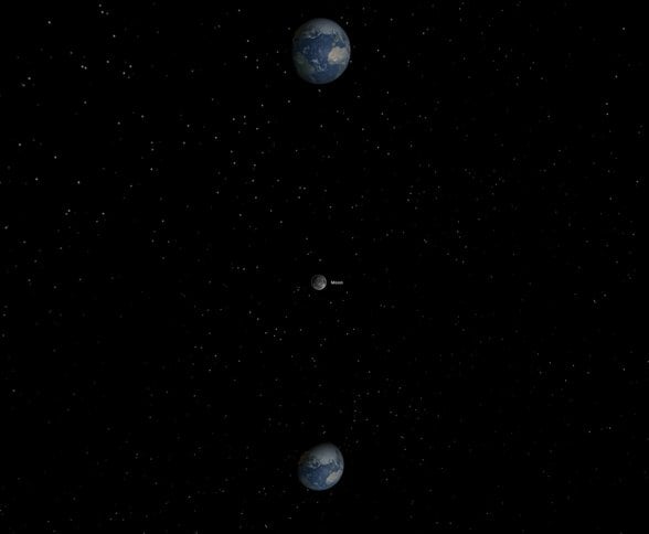 Not: Simülasyonda Dünya'larda pozisyon kilidi açık olduğu için birbirlerine kütleçekim kuvveti uygulasalar da (ve Ay da onlara kütleçekim kuvveti uygulasa da) hareket edemiyorlar. Gerçekte böyle bir kilit mümkün değil tabii ki. Ama o varsayımda bulunmadığınız zaman, belli bir yörünge kullanmak zorunda kalıyorsunuz ve yörünge mekaniği, diğer birçok detayı da netleştirmeden bu soruyu net olarak sormanızı imkansız hale getiriyor. Dolayısıyla "sabit Dünya" varsayımı yapmak zorundayız, aksi takdirde simülasyonu nasıl başlattığınız sonucu çok etkiliyor ve genel geçer bir cevap verilemez hale geliyor.
