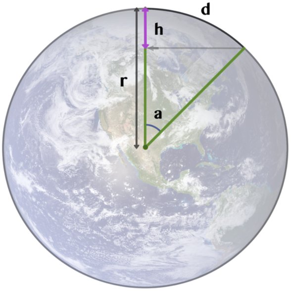 Dünya'nın yarıçapının (rr) 6371 kilometre, çevresinin (CC) 40.030 kilometre civarında olduğunu biliyoruz. Siz, belli bir mesafede (dd), yükseklikte (hh) meydana gelen değişimi soruyorsunuz (spesifik olarak d=1kmd=1 \text{km} olduğunda).