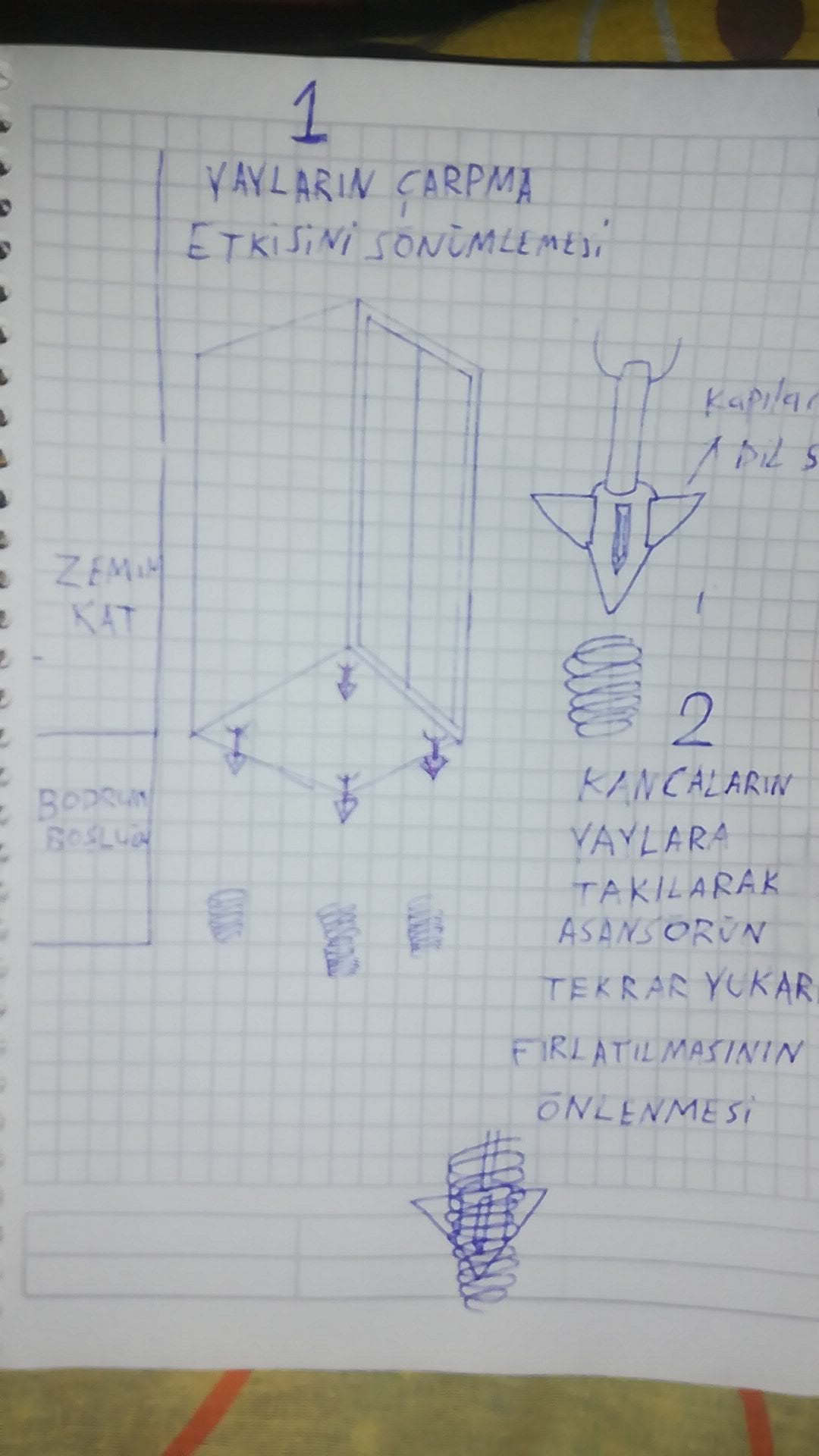 Asansörlü binalarda her zaman asansörler için sağlam çelik yaylar döşenmiş ek bir 'bodrum boşluğu' yapılarak düşen asansörün yere çakılması önlenebilir ve resimde de gördüğünüz üzere asansörün diplerine kapılardaki dil sistemiyle donatılmış kanca benzeri tutucular yapılabilir ve bu sayede gerilen yaylara takılmış asansörün tekrar yukarı fırlatılması da önlenebilir mi? Onca önlemlere rağmen asansör yinede düşerse diye.(çizimde, kancalardaki dil yaylara göre değil ama yapılabilir kısaca sistem bu)
