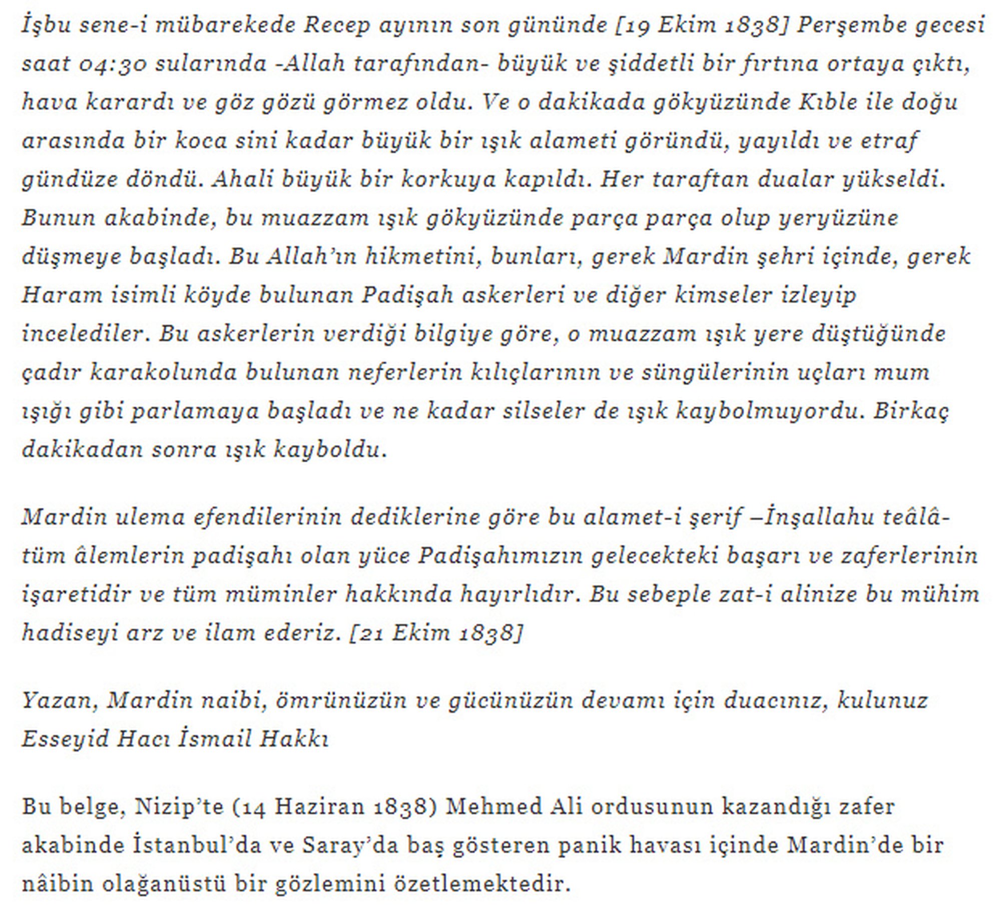 Sofya Osmanlı Arşivinde, 1838 tarihinde Mardin’de gözlemlenmiş “UFO” veya meteor benzeri bir cisim hakkında bir belge bulunuyor.(ekte sadeleştirilmiş hali mevcut.) Bu belgeye göre meteor yere düştüğünde askerlerin kılıçları ve süngüleri dakilarca parlamış. Bunun nedeni nedir?