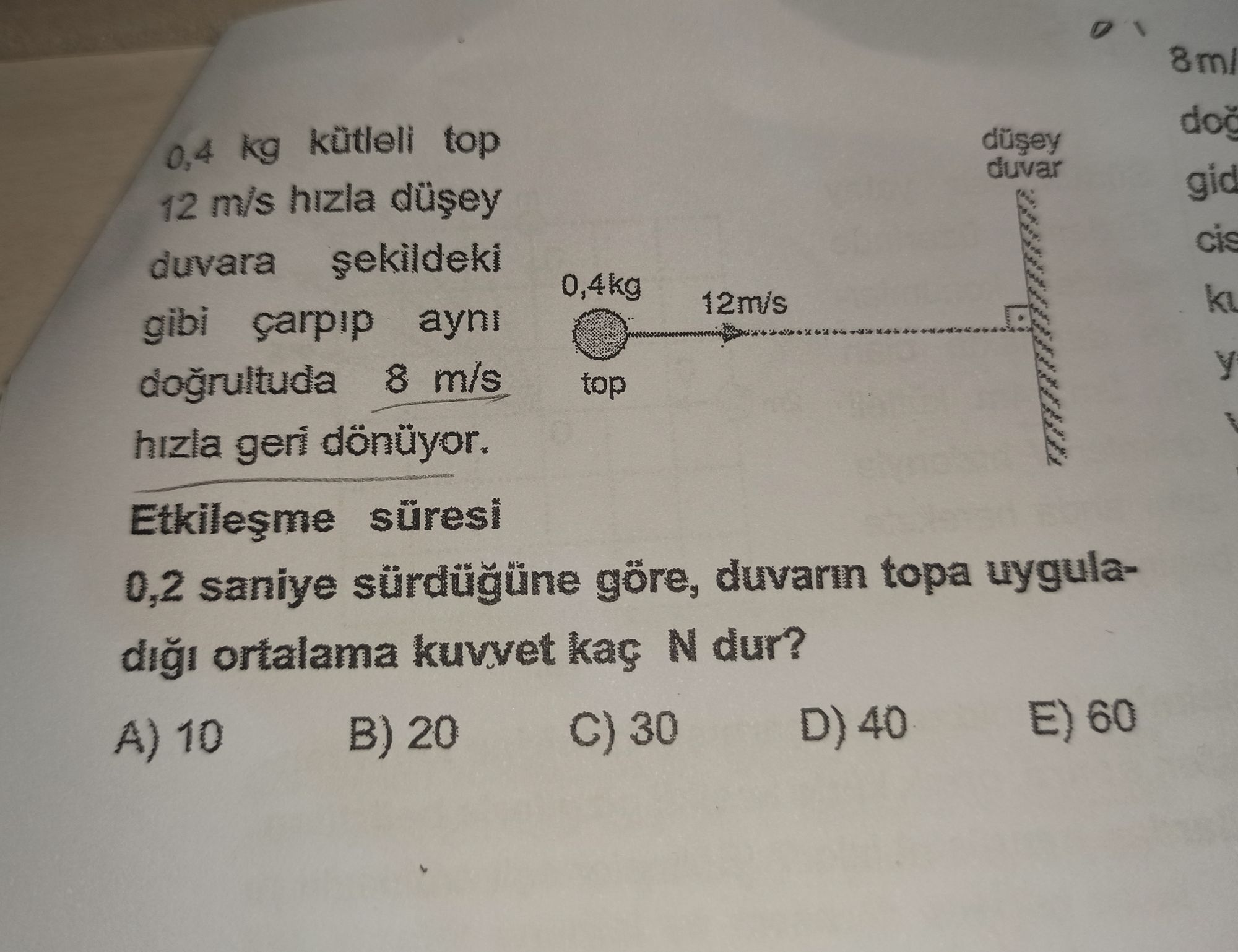 Topun momentumu P=mv=0,4*12=4,8kgm/s2;, çarptıktan sonraki momentumu =0,4*-8=-3,2 kgm/s2; hız -8m/s dir; momentum değişimi=4,8-(-3,2)=8 kgm/s2; etkileşme süresi 0,2 saniye ; ortalama kuvvet= Momentumdaki değişim/etkileşme süresi= 8/0,2=40 N dur.