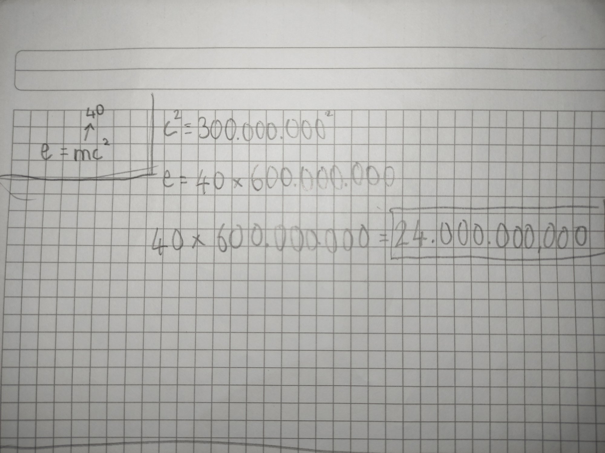 E=mc2 enerji ile kütlenin birbirine dönüşebileceğini göstermektedir.Kütle(m) ışık hızının karesiyle(c2)çarpılınca maddenin sahip olduğu enerji hesaplanılabilir.Bunları doğru yapmışsın ama c2 600.000.000 değil 90.000.000.000 sayısıdır o yüzden hesabın yanlış gerçek cevap 3.600.000.000.000 sayısıdır