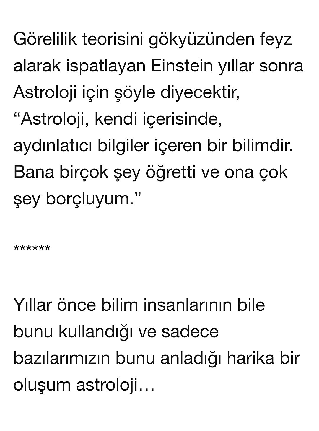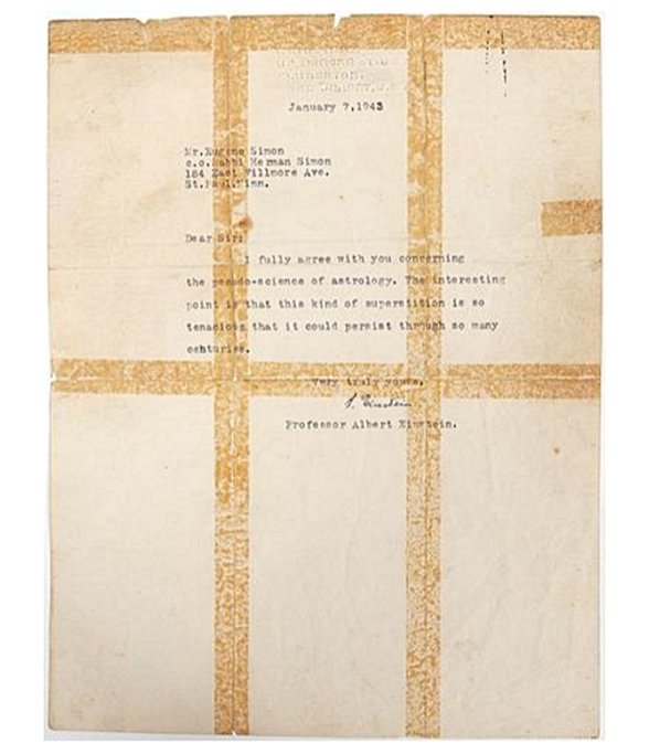 Einstein’ın astrolojiye dair olumlu bir şeyler söylediğine dair dolaşan sözler tamamen uydurma. Aslında Einstein astrolojiyi bilimsel değeri olmayan bir alan olarak görmüş ve bunu net bir şekilde belirtmiş. 1943 yılında yazdığı bir mektupta da astrolojiyi “bilim dışı” bir inanç sistemi olarak nitelemiş. Yani onun astroloji hakkında “aydınlatıcı gerçekler içerdiği” gibi sözler söylediğine dair güvenilir bir kaynak yok.