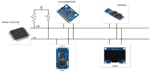 I2C, aralarında veri alışverişi yapabilen bir master ve birden çok slave cihazı arasında seri bir haberleşme protokolüdür. Çift telli bir yapı kullanır: SDA (Veri Hattı) ve SCL (Saat Hattı). I2C protokolünde, her cihazın benzersiz bir adresi vardır ve master cihaz, iletişim kurmak istediği slave cihazın adresini kullanarak veri gönderir veya alır. I2C, birçok sensör ve modül için kullanılan yaygın bir haberleşme protokolüdür. Mesela, hız, ışık, basınç sensörleri ve LCD ekran kontrolcüleri I2C üzerinden iletişim kurabilir. Ayrıca küçük boyutlu EEPROM belleklerde veri depolamak için tercih edilir.[2]
