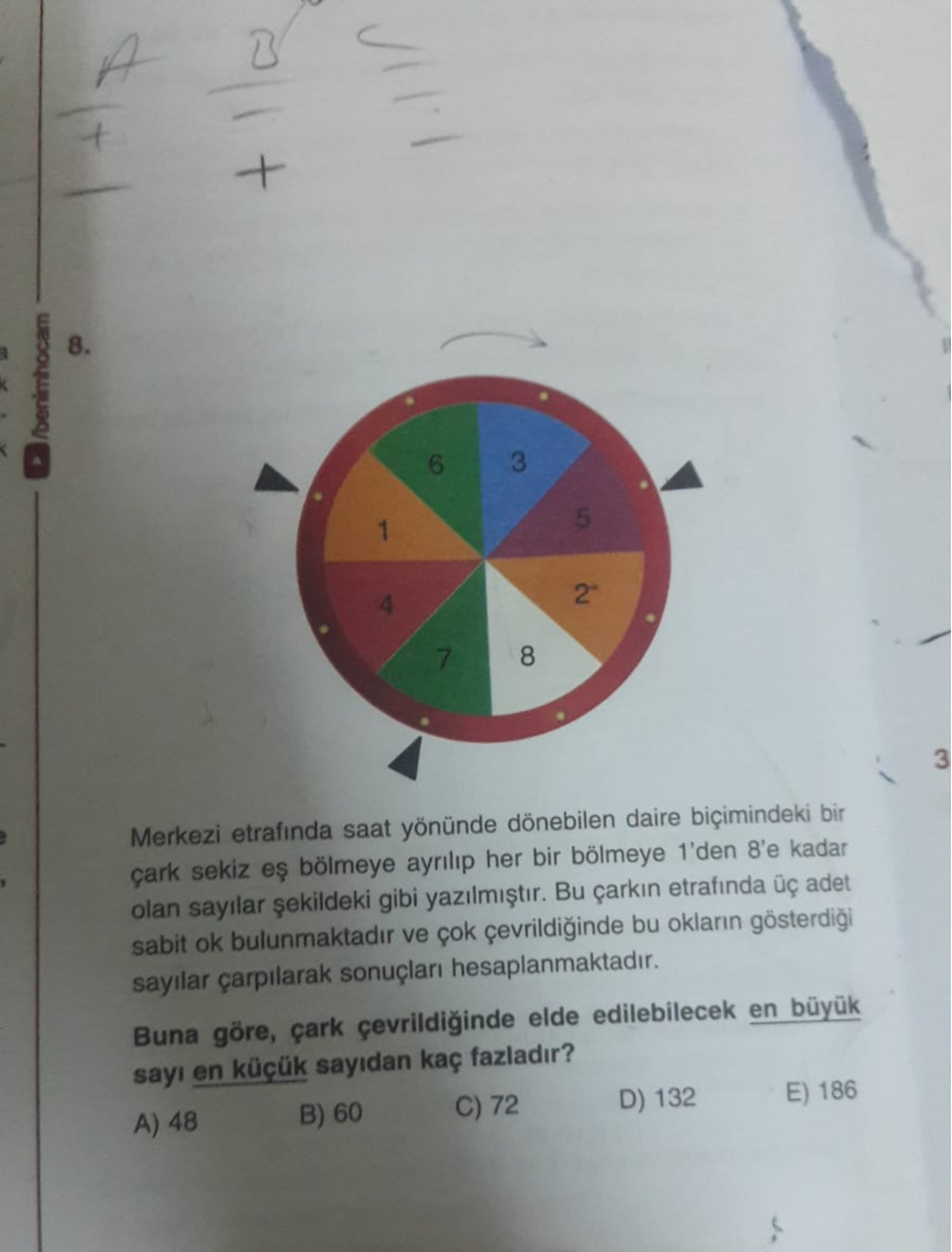 çarkın iki ucunun arasında 2 şer bölüm var ve tek bir bölümde de bir bölüm var. çarkın önüne geliş şekli en fazla 7.5.6 olur iken en az 2.3.4 oluyor. 210-24 ile cevap 186. Bu tarz sorulara biraz daha şekili kafamızda kağıda oturtarak çözebiliriz.